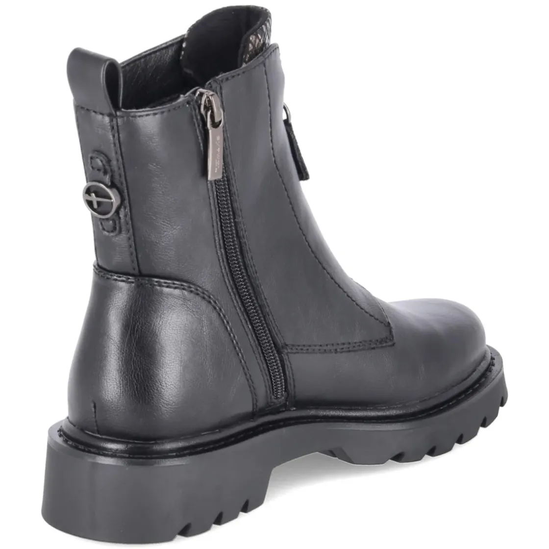 Der Tamaris Boot in Schwarz verbindet moderne Optik mit verlässlichem Tragekomfort. Das Obermaterial aus Synthetik wird bei diesem Damenmodell durch vegane Materialien ergänzt und präsentiert sich mit runder Schuhspitze und seitlichem Reißverschluss für bequemes An- und Ausziehen. Eine Front mit Zierreißverschluss und der dezente Schlangenprint auf der Zunge setzen stilvolle Akzente. Das gepolsterte Fußbett und die textile Decksohle sorgen für weiche Auftritte, während der verstärkte Fersenbereich Stabilität verleiht. Mit 4 cm Blockabsatz bleibt die Silhouette alltagstauglich, die flexible, rutschfeste Profilsohle unterstützt sicheren Halt auf verschiedenen Untergründen. Der Passformhinweis fällt normal aus und macht Entscheidungen leicht. Modetipp: In Kombination mit schwarzer Slim-Fit-Jeans und Oversize-Blazer entsteht ein urbaner Look, der vom Büro bis zum After-Work stimmig bleibt.