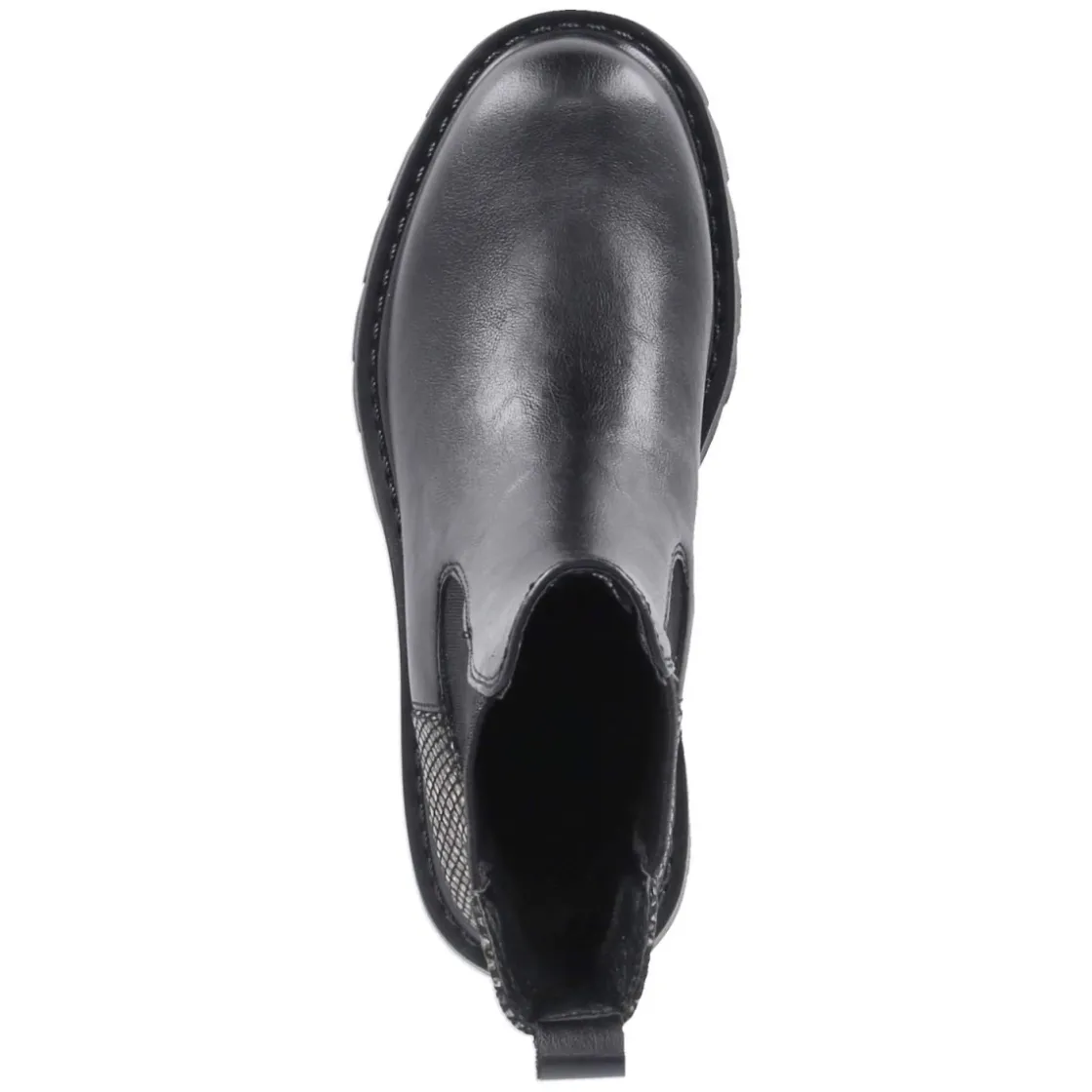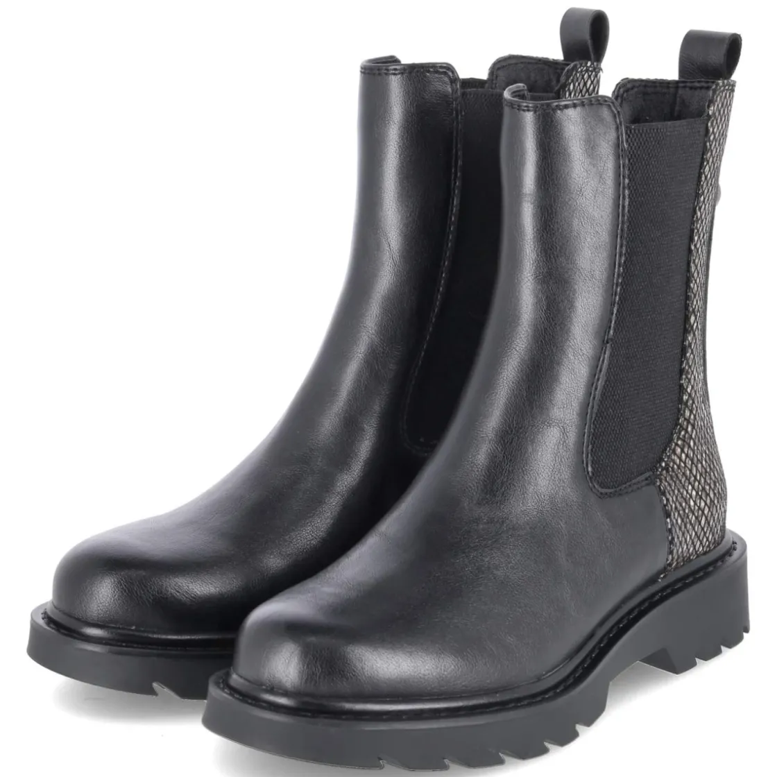 Der Chelsea Boot von Tamaris vereint klares Design mit Komfort und setzt dank der veganen Materialien ein bewusstes Statement. Schwarzes Obermaterial aus Textil und Synthetik, runde Spitze und zwei großflächige Elastikeinsätze sorgen für den charakteristischen Look und einfaches Hineinschlüpfen. Der 4 cm hohe Blockabsatz bietet Stabilität, während die beste Memory-Foam-Fußbettung mit textiler Decksohle den ganzen Tag weich polstert. Eine verstärkte Ferse mit Logo und Anziehlasche, die rutschfeste Profilsohle sowie der hintere Schaft mit subtiler Reptilstruktur in Schlangen-Optik runden das Modell ab. Der Fit fällt größengetreu aus und richtet sich an Erwachsene. Modetipp: Mit Cropped-Jeans und strukturiertem Wollmantel entsteht ein moderner City-Look, ein Satin-Midirock setzt den reptilen Akzent am Schaft elegant in Szene.