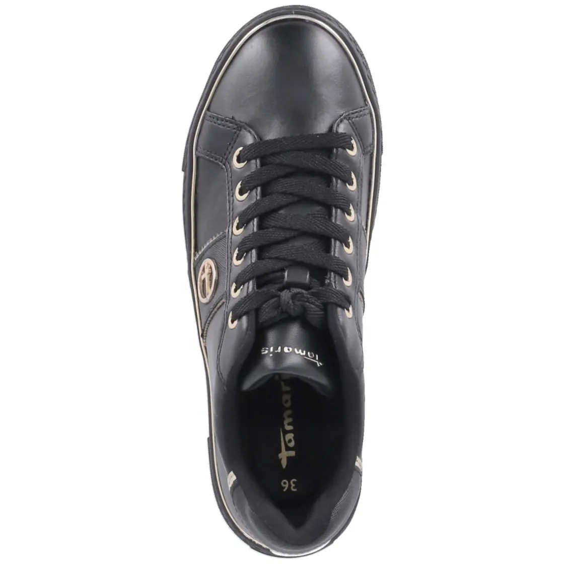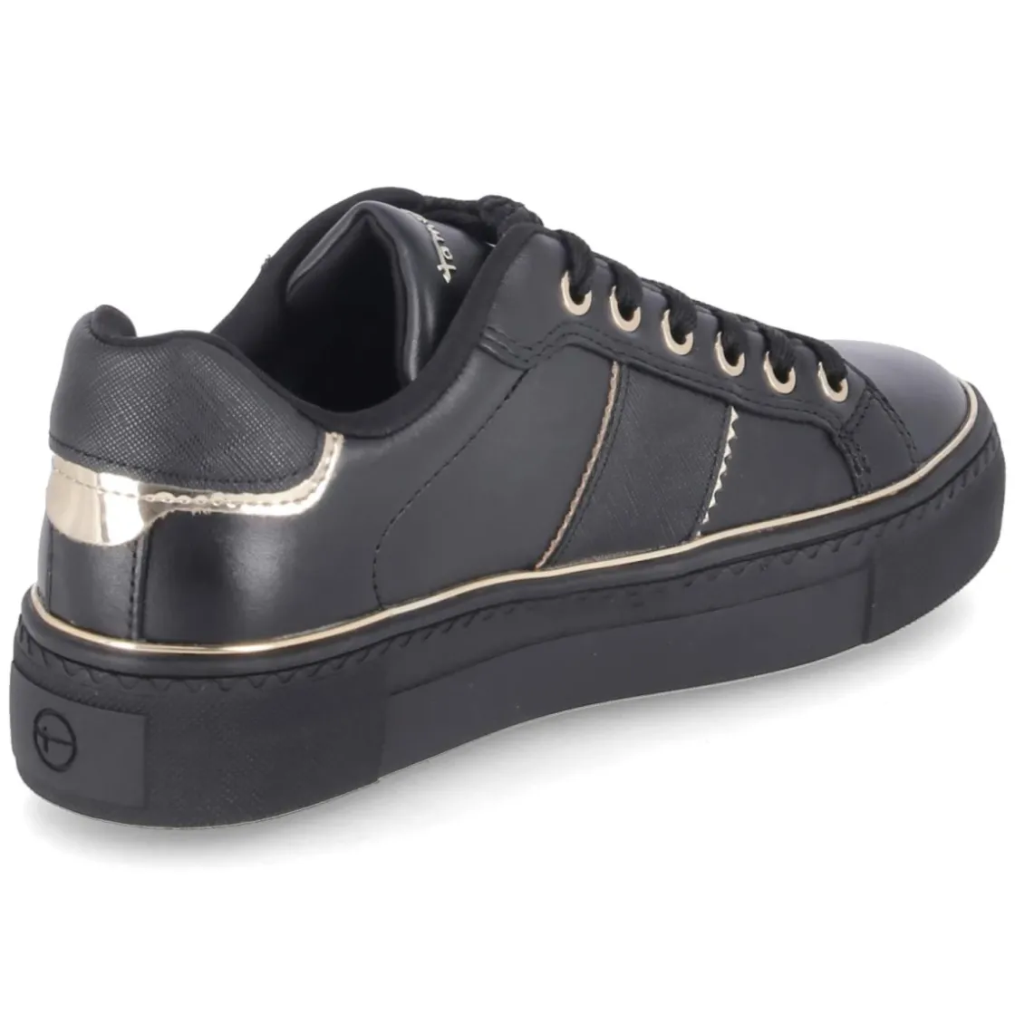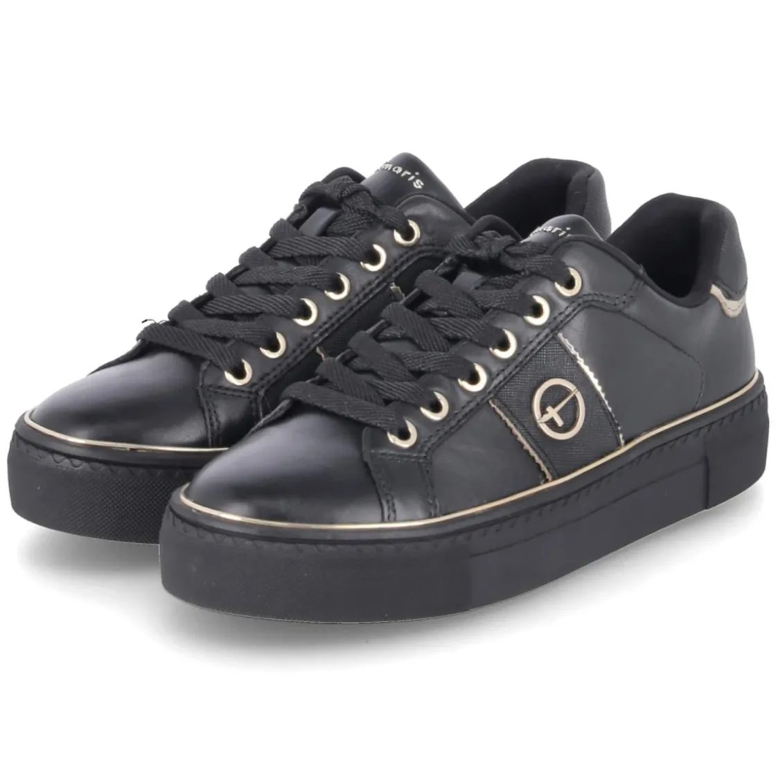 Der Low Sneaker von Tamaris setzt auf einen modernen Material-Mix aus Leder und Synthetik und zeigt in zeitlosem Schwarz, wie Casual-Design und feine Details zusammengehen. Golden schimmernde Highlights und seitliche Streifen verleihen dem cleanen Look eine elegante Note, die sich mühelos zwischen Alltag und Freizeit bewegt. Schnürsenkel und runde Schuhspitze sorgen für klassischen Appeal, während gepolsterter Einstieg, verstärkter Fersenbereich und die rutschhemmende Cupsohle angenehmen Halt über den ganzen Tag liefern. Die textile Decksohle trifft auf ein komfortables Wechselfußbett, das individuellen Ansprüchen gerecht wird und bei Bedarf im Handumdrehen ausgetauscht werden kann. Der Schuh fällt normal aus und überzeugt mit besonders guten Kombinationsmöglichkeiten – von Denim bis Tailoring. Modetipp: Zu schwarzer Cropped-Jeans, weißem T‑Shirt und Oversize-Blazer entsteht ein smarter City-Look, den goldene Accessoires harmonisch abrunden.