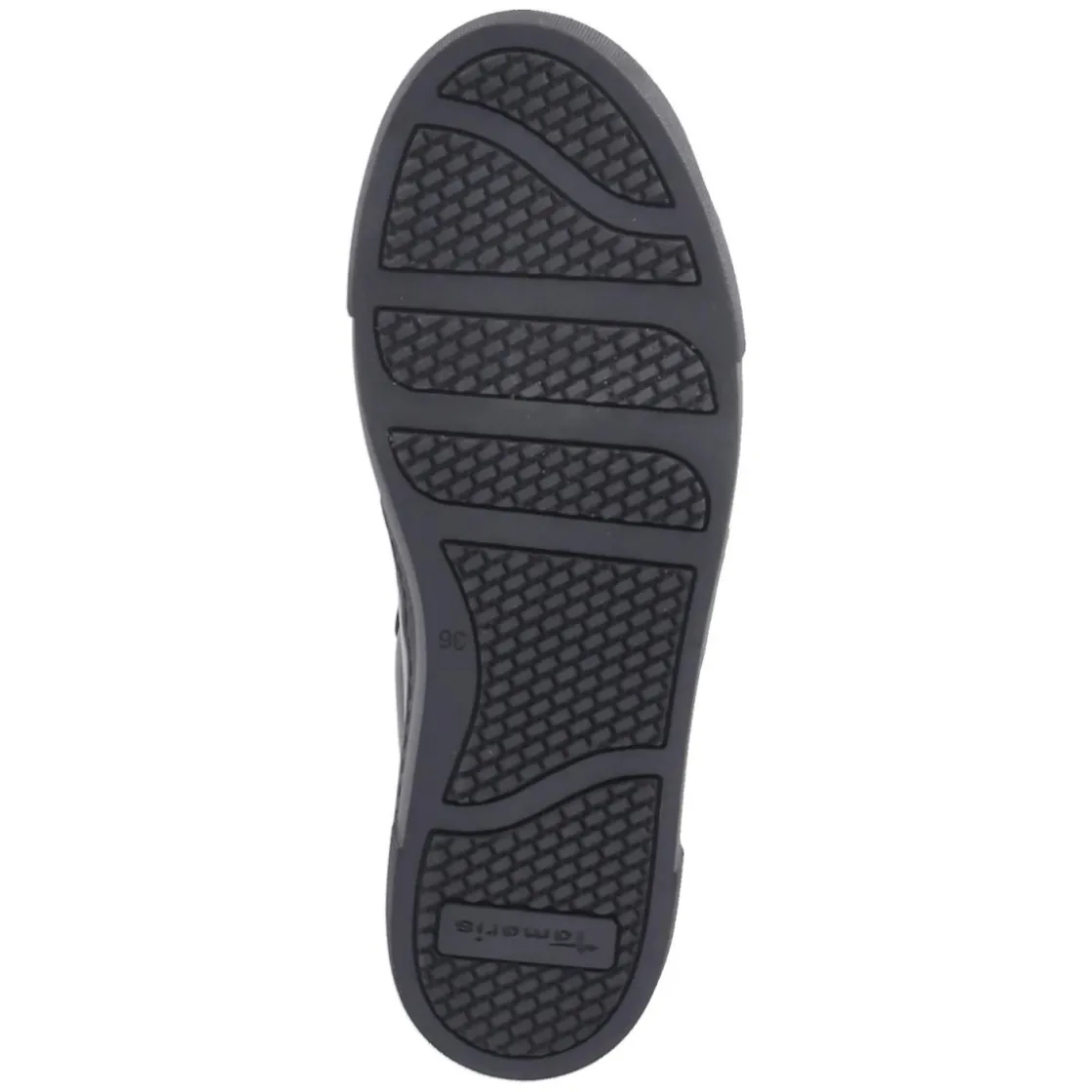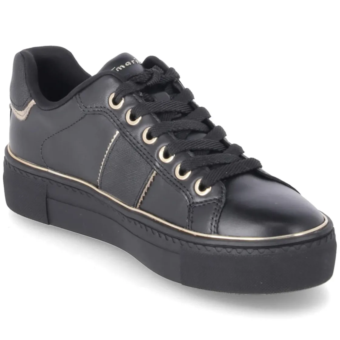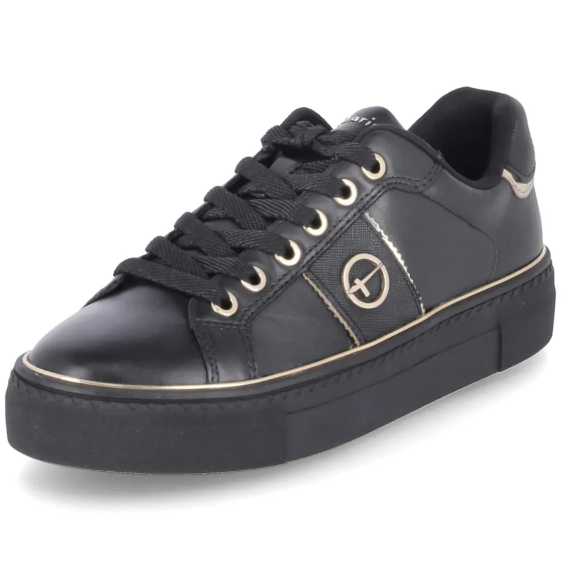 Der Low Sneaker von Tamaris setzt auf einen modernen Material-Mix aus Leder und Synthetik und zeigt in zeitlosem Schwarz, wie Casual-Design und feine Details zusammengehen. Golden schimmernde Highlights und seitliche Streifen verleihen dem cleanen Look eine elegante Note, die sich mühelos zwischen Alltag und Freizeit bewegt. Schnürsenkel und runde Schuhspitze sorgen für klassischen Appeal, während gepolsterter Einstieg, verstärkter Fersenbereich und die rutschhemmende Cupsohle angenehmen Halt über den ganzen Tag liefern. Die textile Decksohle trifft auf ein komfortables Wechselfußbett, das individuellen Ansprüchen gerecht wird und bei Bedarf im Handumdrehen ausgetauscht werden kann. Der Schuh fällt normal aus und überzeugt mit besonders guten Kombinationsmöglichkeiten – von Denim bis Tailoring. Modetipp: Zu schwarzer Cropped-Jeans, weißem T‑Shirt und Oversize-Blazer entsteht ein smarter City-Look, den goldene Accessoires harmonisch abrunden.
