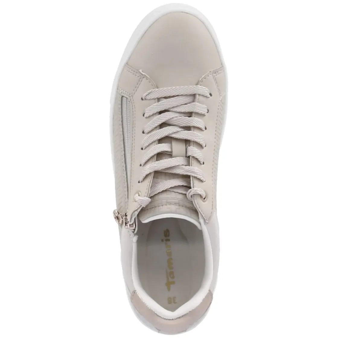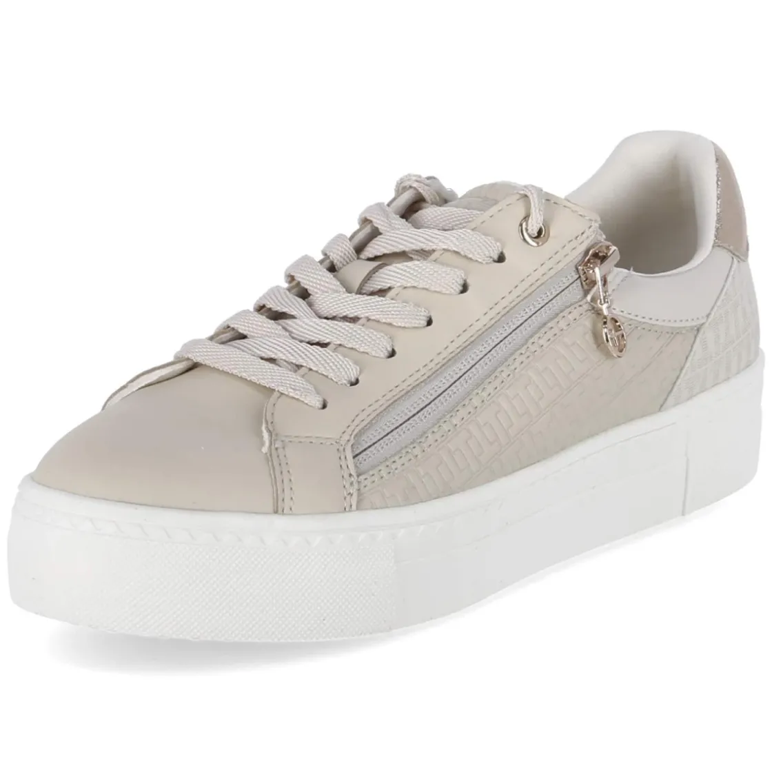 Dieser Low Sneaker von Tamaris verbindet eine moderne Optik mit smarten Details. Das gemusterte Obermaterial aus Textil und Synthetik in elegantem Beige wirkt frisch und vielseitig, die runde Spitze und das 3,5 cm hohe Plateau sorgen für einen zeitgemäßen Look mit leichtem Lift. Praktisch wird es dank Schnürsenkeln und zusätzlichem Reißverschluss, der das An- und Ausziehen erleichtert. Das komfortable Wechselfußbett mit textiler Decksohle bietet angenehme Dämpfung und lässt sich bei Bedarf einfach austauschen. Aus veganen Materialien gefertigt, fällt das Modell normal aus und eignet sich als zuverlässiger Begleiter im Alltag. Modetipp: Zu locker geschnittenen Anzughosen und einem feinen Stricktop entsteht ein lässig-elegantes City-Outfit, das das Muster dezent in Szene setzt.