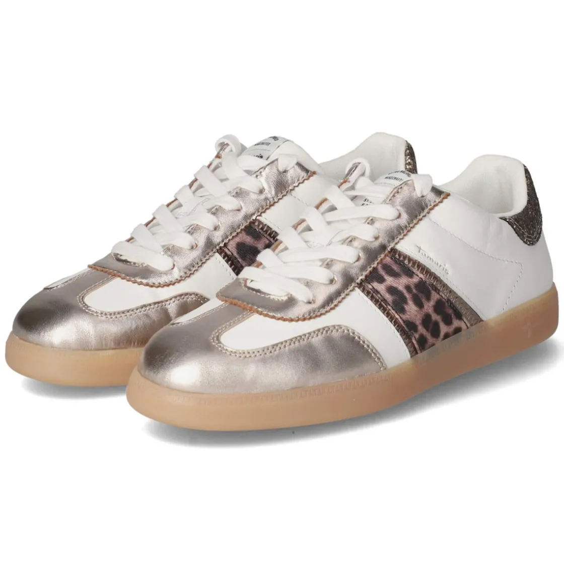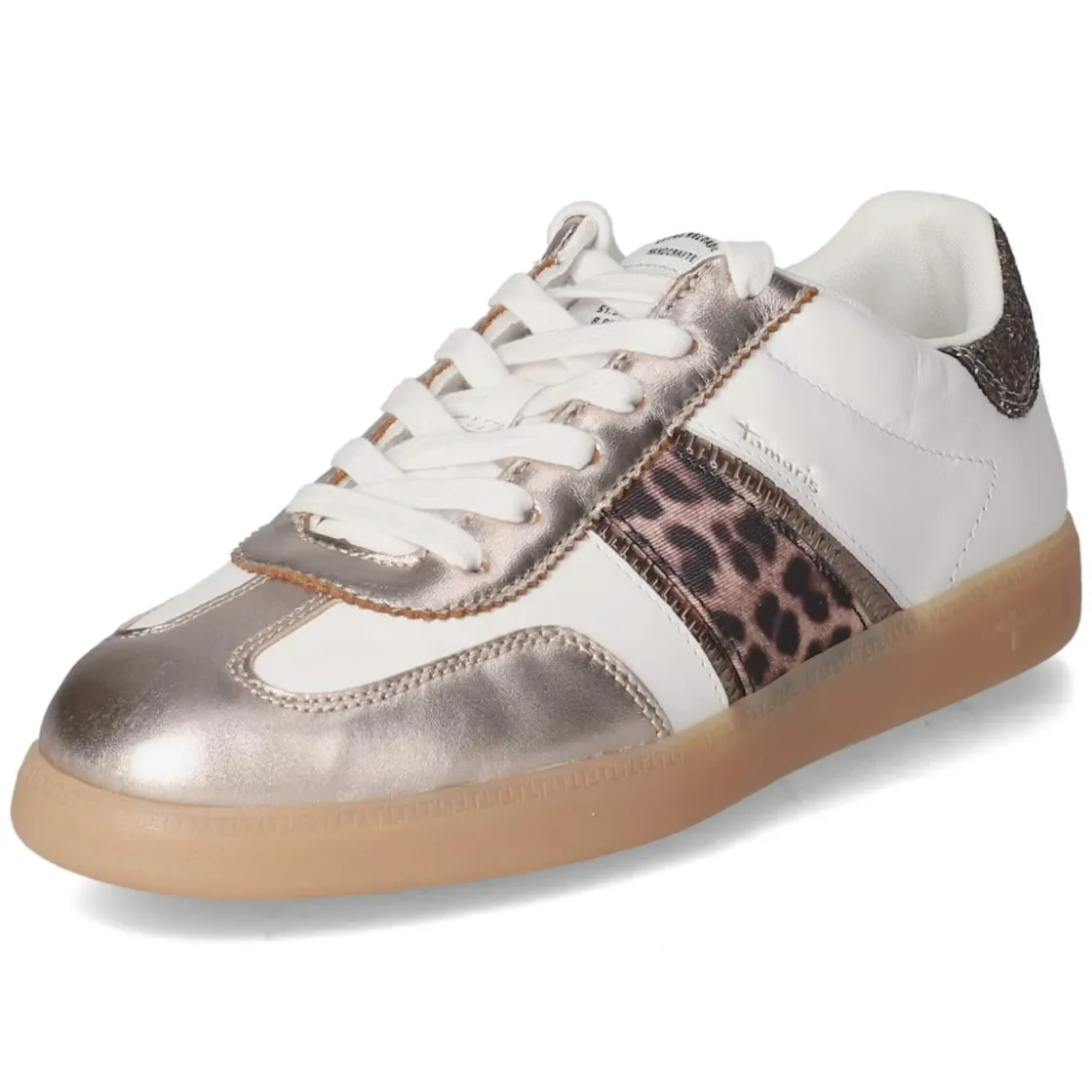 Der Low Sneaker von Tamaris verbindet cleanes Weiß mit subtilen Highlights und schafft so einen frischen Daily-Style. Das Obermaterial aus Synthetik, Leder und Textil setzt moderne Overlays in Szene, Teile im Animaldesign und goldfarbene Akzente sorgen für einen modischen Twist, während die Ferse mit Glitzer einen funkelnden Abschluss bildet. Runde Schuhspitze, normaler Fit und die Schnürung erlauben eine individuelle Anpassung. Ein gepolsterter Einstieg und das herausnehmbare, weich gepolsterte Wechselfußbett mit Textildecksohle bieten Komfort von früh bis spät. Stabilität liefern verstärkter Zehen- und Fersenbereich, die flexible, rutschhemmende Laufsohle sorgt für sicheren Tritt. Markendetails runden den Look ab. Modetipp: Besonders modern wirkt der Sneaker zu Cropped-Mom-Jeans, cremefarbenem Blazer und filigranen Gold-Accessoires; Socken in Offwhite schließen den Look harmonisch ab.