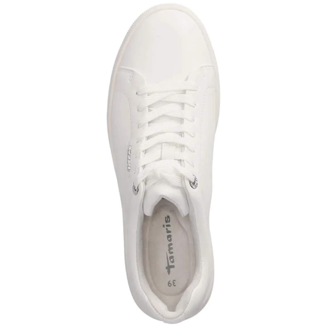 Der Low Sneaker von Tamaris aus langlebigem Glattleder präsentiert sich in klarem Weiß mit runder Spitze und sportlich-eleganter Linienführung. Das Modell fällt größengetreu aus und bietet dank Schnürung eine individuelle Anpassung, während eine verstärkte Ferse zusätzliche Stabilität verleiht. Ein gepolsterter Einstieg und leichtes Textilfutter sorgen für angenehm weiches Tragegefühl. Das komfortable, gepolsterte Wechselfußbett lässt sich bei Bedarf austauschen und unterstützt entspanntes Gehen über den ganzen Tag. Modische Ziernähte und dezente Markendetails unterstreichen die hochwertige Verarbeitung. Die flexible, rutschhemmende Laufsohle sichert zuverlässigen Halt auf verschiedenen Untergründen und macht den Sneaker zum vielseitigen Begleiter für Alltag und Freizeit. Modetipp: Im monochromen Styling zu weißer Cropped-Jeans und beigem Trench entsteht ein cleaner Look, alternativ mit gestreiftem Shirt und gekürztem Saum für lässige City-Optik.