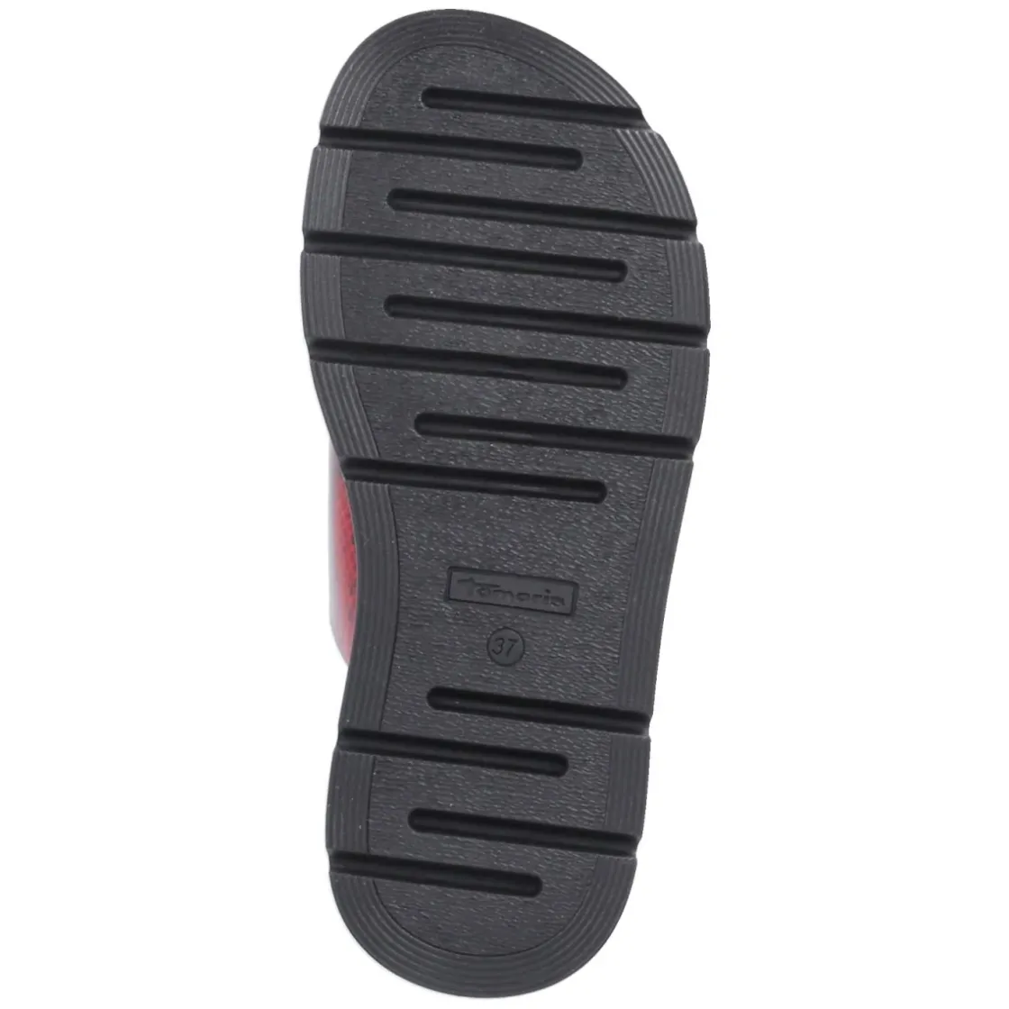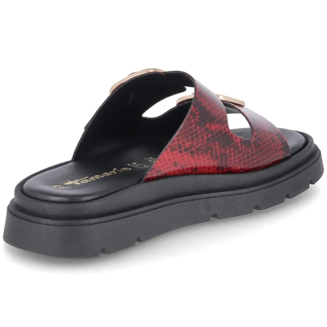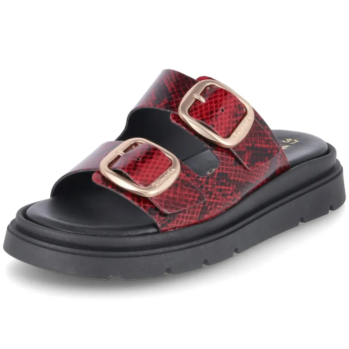 Diese Pantoletten von Tamaris setzen mit glänzender Lackoptik und feiner Reptilprägung in sattem Rot ein klares Statement. Das Obermaterial aus Synthetik zeigt sich pflegeleicht, während zwei verstellbare Schnallen mit Elastikeinsatz sicheren Halt und flexible Passform ermöglichen. Die offene Spitze bringt sommerliche Leichtigkeit, das gepolsterte Fußbett und die Lederdecksohle sorgen für angenehmen Komfort bei jedem Schritt. Dank der starken, rutschfesten Laufsohle mit markantem Profil ist stabiler Tritt auf glatten wie urbanen Untergründen gegeben. Der Schnitt fällt normal aus und begleitet vielseitige Alltags- und Abendlooks. Modetipp: Zu monochromen Outfits in Creme oder Schwarz getragen werden die roten Pantoletten zum Blickfang; harmonisch wirken sie mit Midi-Rock und strukturierter Basttasche.
