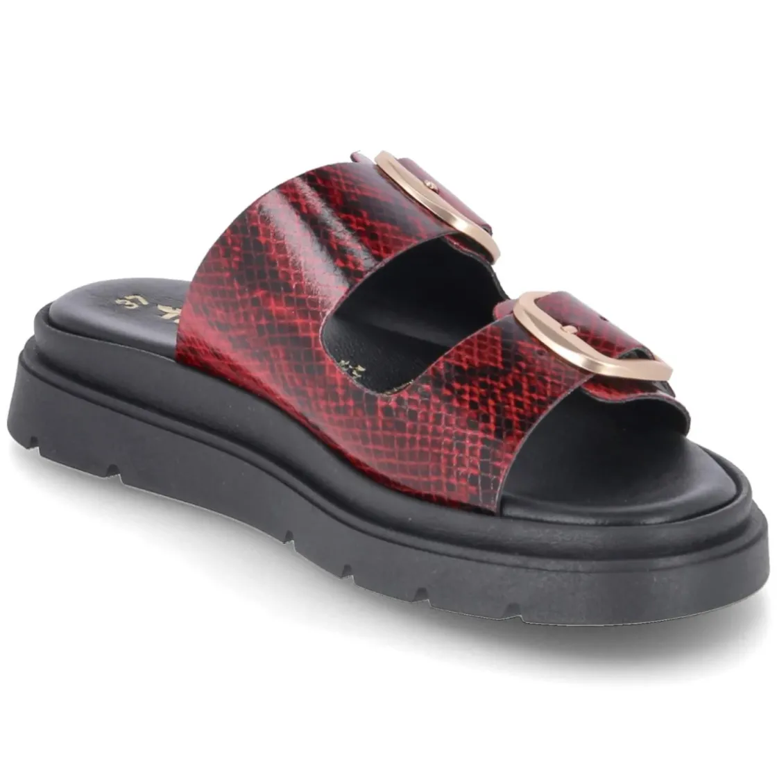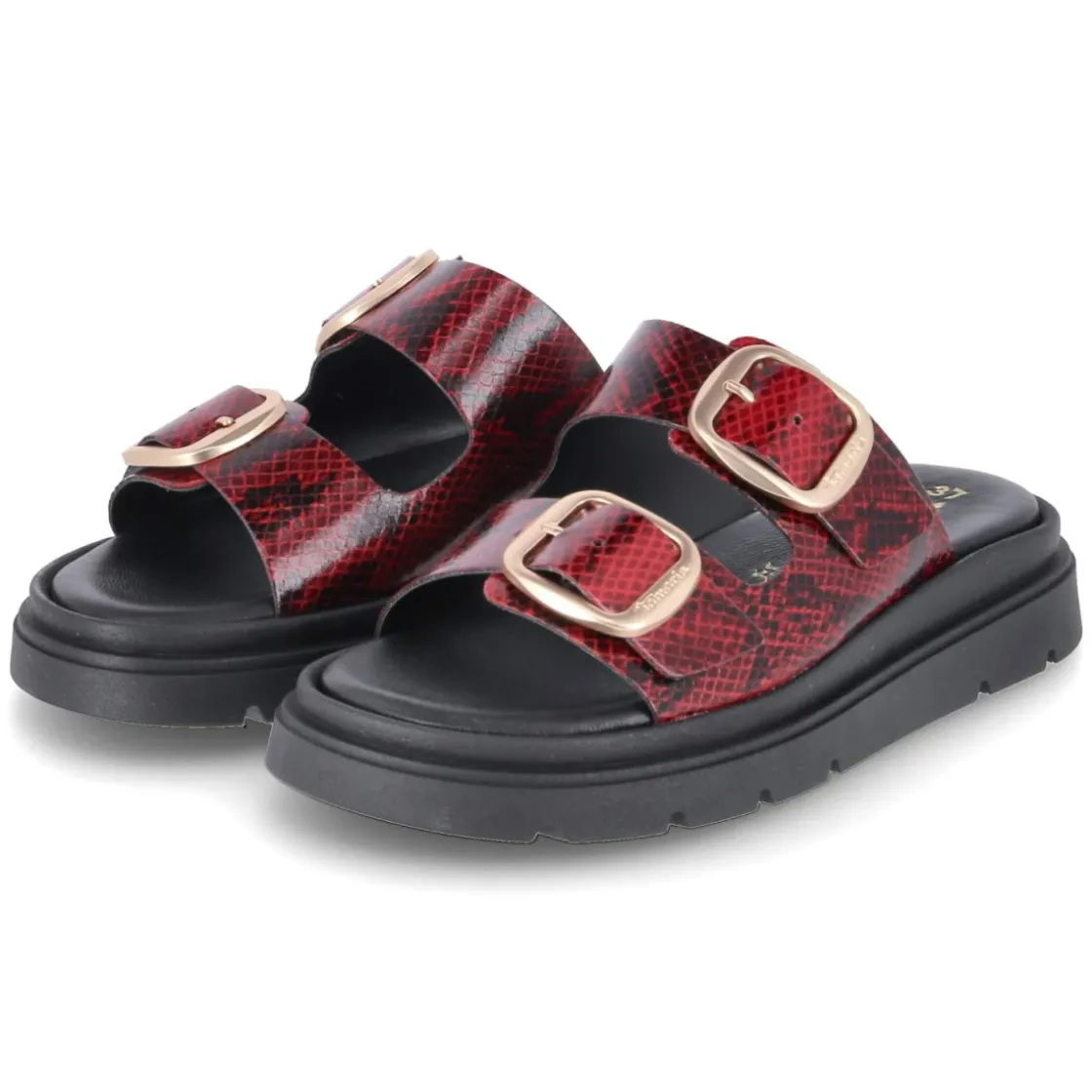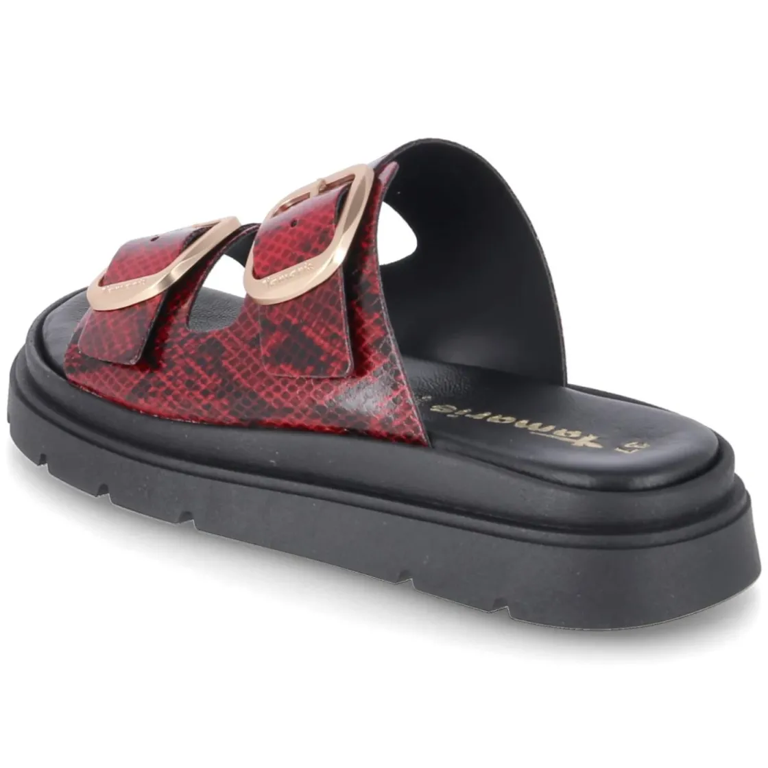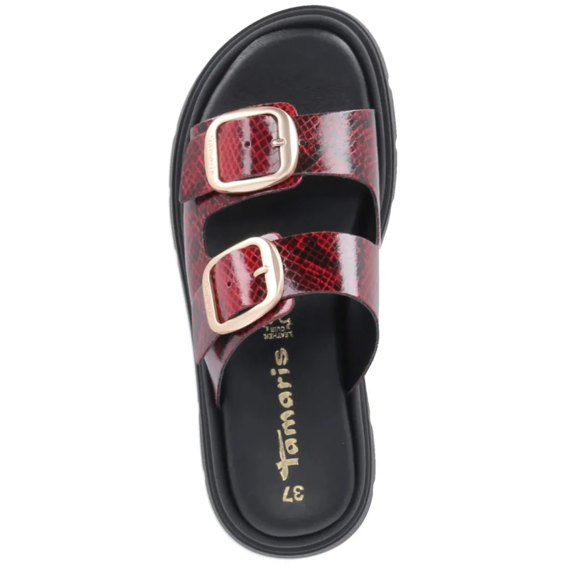 Diese Pantoletten von Tamaris setzen mit glänzender Lackoptik und feiner Reptilprägung in sattem Rot ein klares Statement. Das Obermaterial aus Synthetik zeigt sich pflegeleicht, während zwei verstellbare Schnallen mit Elastikeinsatz sicheren Halt und flexible Passform ermöglichen. Die offene Spitze bringt sommerliche Leichtigkeit, das gepolsterte Fußbett und die Lederdecksohle sorgen für angenehmen Komfort bei jedem Schritt. Dank der starken, rutschfesten Laufsohle mit markantem Profil ist stabiler Tritt auf glatten wie urbanen Untergründen gegeben. Der Schnitt fällt normal aus und begleitet vielseitige Alltags- und Abendlooks. Modetipp: Zu monochromen Outfits in Creme oder Schwarz getragen werden die roten Pantoletten zum Blickfang; harmonisch wirken sie mit Midi-Rock und strukturierter Basttasche.