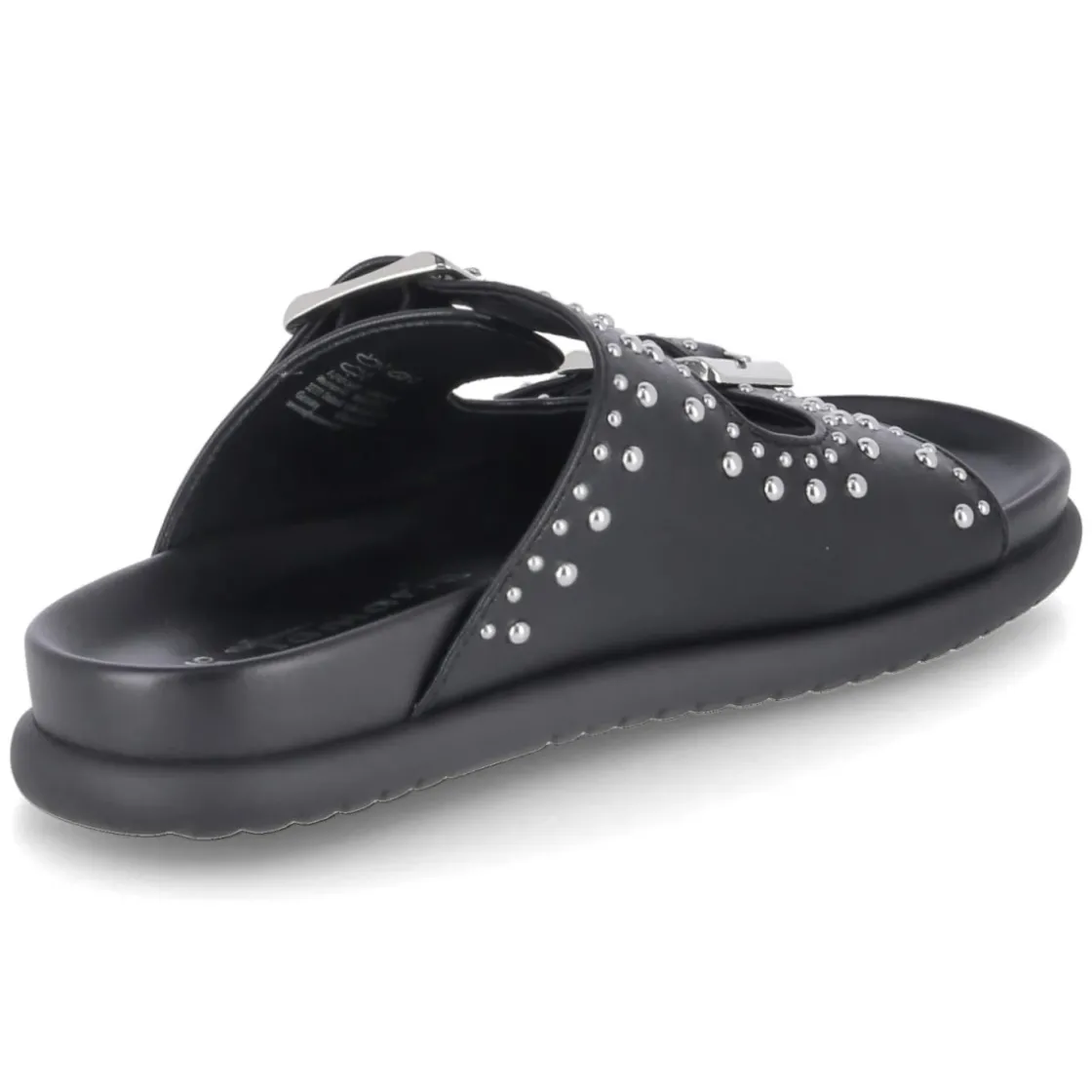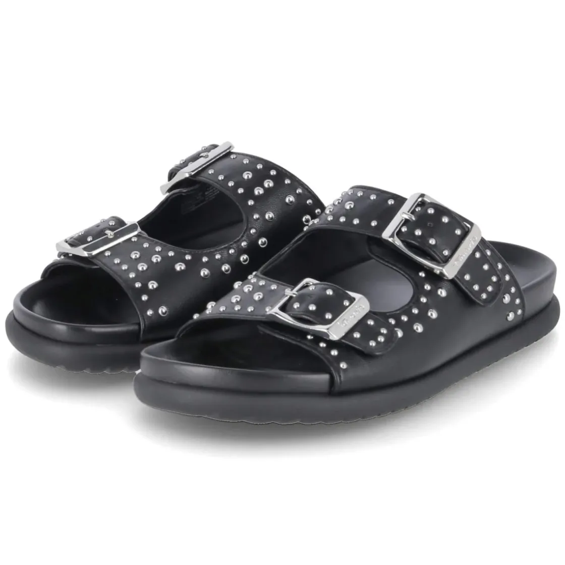 Die Damen-Pantoletten von Tamaris setzen auf schlichte Eleganz mit schwarzem Synthetik-Obermaterial und silbernen, runden Nieten als dezentem Hingucker. Zwei verstellbare Schnallen mit Elastikeinsatz sorgen für flexiblen Halt und erleichtern das Anpassen, während die offene Schuhspitze sommerliche Leichtigkeit bringt. Das gepolsterte Tieffußbett verwöhnt bei jedem Schritt, die pflegeleichte Oberfläche überzeugt im Alltag. Eine flexible, griffige Laufsohle bietet Stabilität auf verschiedenen Untergründen, der Fit fällt angenehm normal aus und macht die Größenauswahl unkompliziert. Die Synthetik-Decksohle ergänzt das komfortorientierte Design. Modetipp: Für einen cleanen City-Look mit Leinenhose in Naturtönen und schwarzer Crossbody-Bag kombinieren; für abends mit Satinrock und Metallic-Accessoires die Nieten subtil aufgreifen.