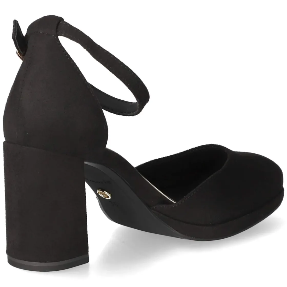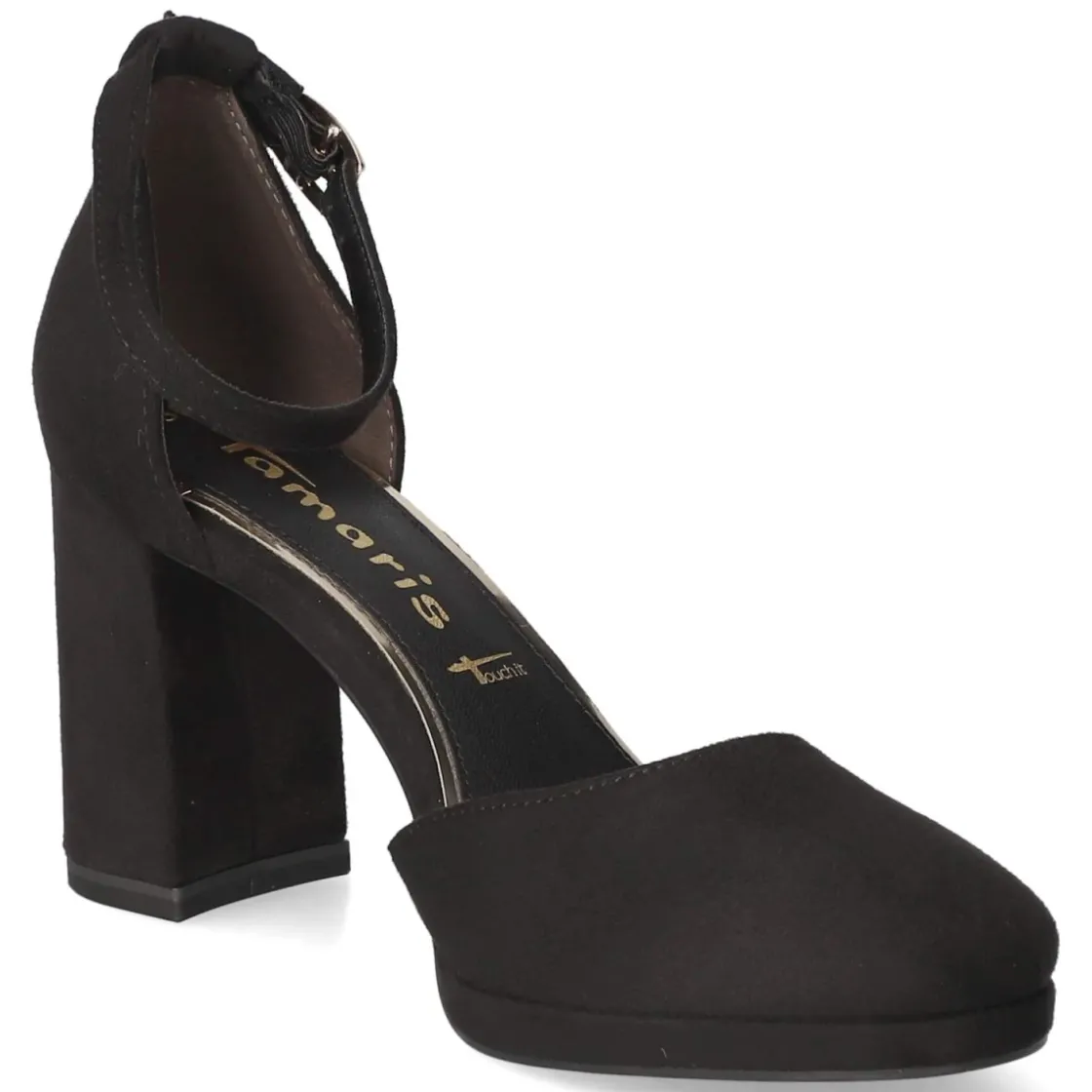 Der Tamaris Pumps in klassischem Schwarz verleiht jedem Look eine elegante Note. Sein 8 cm hoher Blockabsatz sorgt für souveräne Höhe und dank der stabilen Form für angenehmen Stand. Das Obermaterial aus hochwertigem Synthetik zeigt eine samtige Oberfläche, die von dezenten, goldenen Akzenten edel gerahmt wird. Die runde Schuhspitze wirkt zeitlos feminin, während die verstellbare Schnalle mit integriertem Elastikeinsatz sicheren Halt und ein komfortables Einsteigen ermöglicht. Eine weich gepolsterte Decksohle aus Textil und die rutschfeste Laufsohle unterstützen Komfort und Trittsicherheit im Alltag und am Abend. Das Modell fällt normal aus und ist vollständig aus veganen Materialien gefertigt – stilbewusste Wahl ohne Kompromisse. Modetipp: Zu einem fließenden Midikleid oder einem Tailoring-Ensemble in Creme entfaltet der Pumps seine klassische Stärke; filigraner Goldschmuck greift die Metall-Details harmonisch auf.
