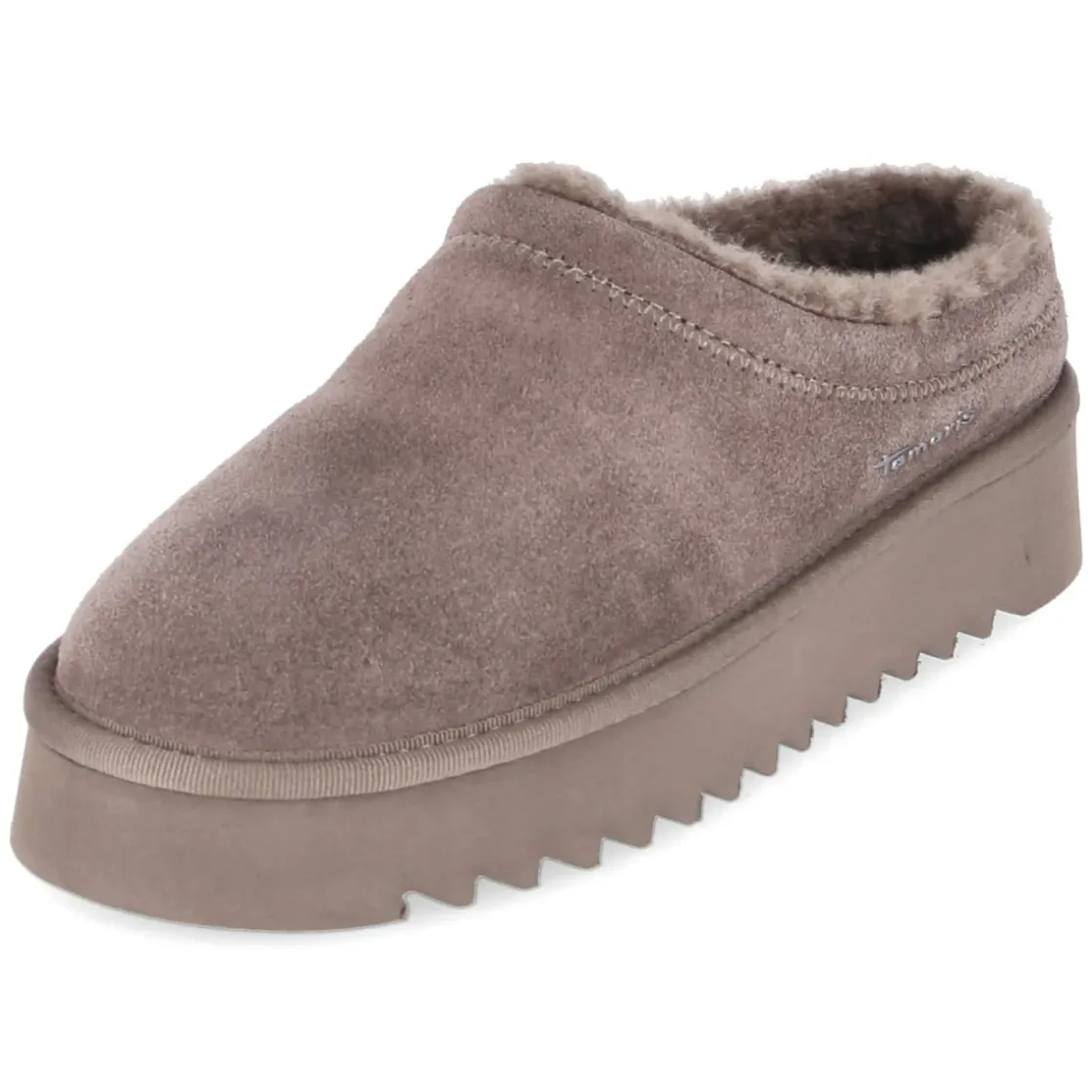 Der Tamaris Sabot in Taupe verbindet lässige Optik mit durchdachtem Komfort. Das Obermaterial aus Rauleder unterstreicht den robusten Charakter von Echtleder, während die runde Schuhspitze und die reduzierte Silhouette spielerische Nonchalance ausstrahlen. Der Plateau-Absatz von 3,5 cm sorgt für eine angenehme Erhöhung und bleibt dank des geringen Gewichts überraschend leichtfüßig. Warmfutter und eine Decksohle aus Textil und Synthetik bieten behagliche Wärme an kalten Tagen. Ohne Verschluss gefertigt, gleitet der Fuß bequem hinein, die profilierte Laufsohle gewährleistet verlässlichen Grip. Die Passform fällt normal aus und eignet sich für erwachsene Damen, die entspannten Stil mit Funktion schätzen. Modetipp: Zu Wide-Leg-Jeans und einem grob gestrickten Cardigan entsteht ein moderner Cozy-Look, der die sanfte Taupe-Nuance stimmungsvoll betont.