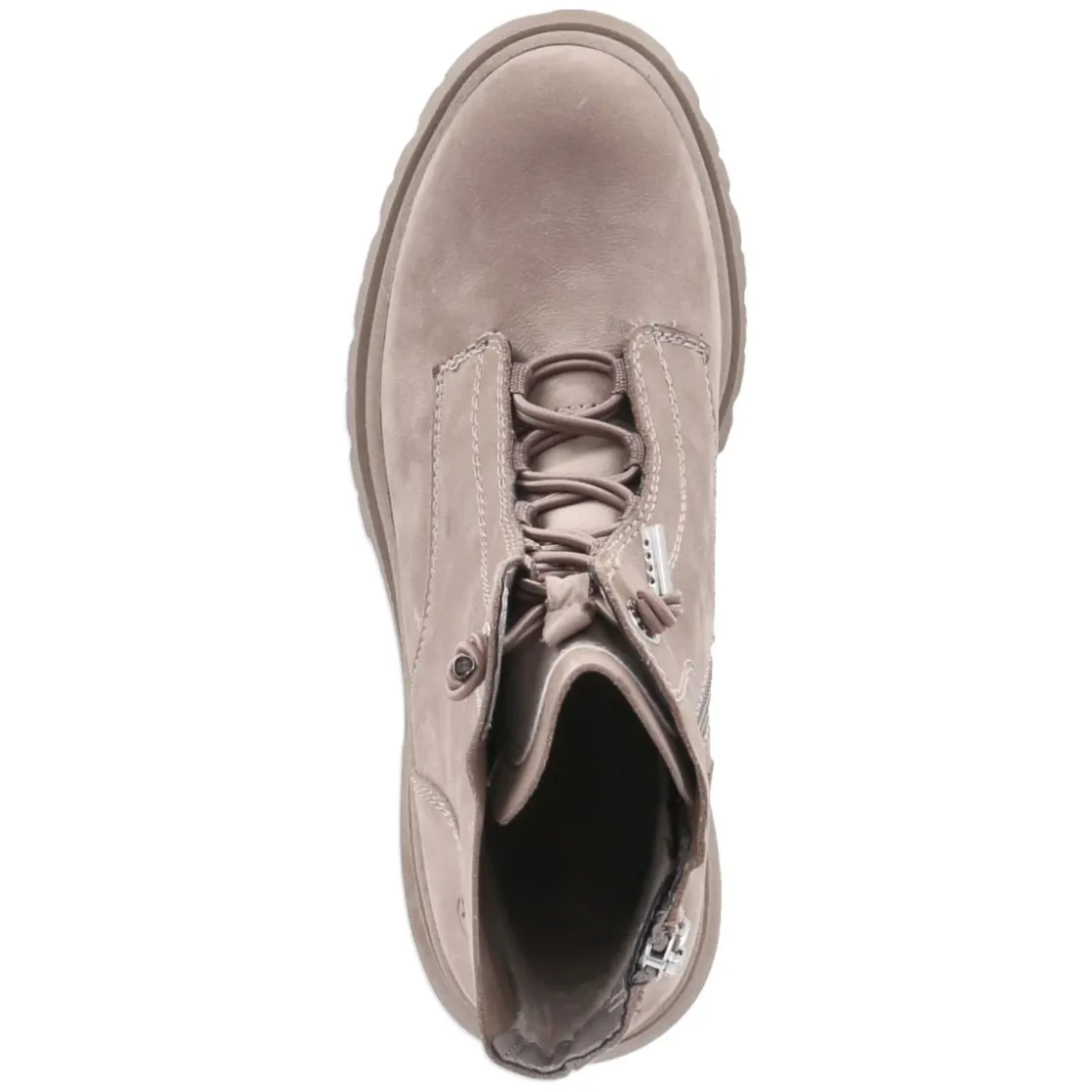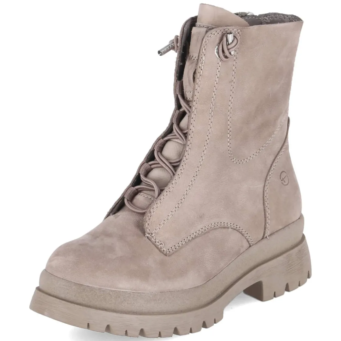 Der Schnürboot von Tamaris in Taupe verbindet urbanen Look mit komfortabler Ausstattung. Der moderne Material-Mix aus Leder und Synthetik wirkt dank Ziernähten und runder Kappe angenehm lässig, während der 5,5 cm hohe Blockabsatz Stabilität bietet. Praktisch ist die Kombination aus Schnürsenkeln mit Elastikschnürung und seitlichem Reißverschluss für einen bequemen Einstieg. Ein leichtes Futter wärmt an kühlen Tagen, das Memory-Foam-Fußbett sorgt für weichen Auftritt. Die textile Decksohle und die rutschfeste Profilsohle unterstützen lange Wege, eine verstärkte Ferse erhöht die Formstabilität. Mit einer Schafthöhe von ca. 16 cm und einem Umfang von ca. 24 cm sitzt der Boot angenehm und fällt in der Größe normal aus. Modetipp: Zu geraden Jeans und Wollmantel kombinieren, dazu ein Strickschal in Naturtönen für einen harmonischen Ton-in-Ton-Look.