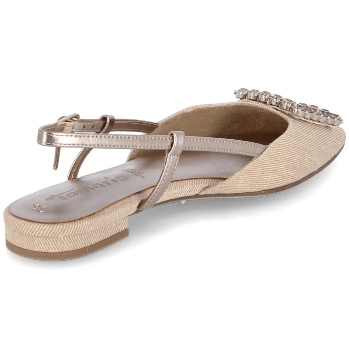 Die Slingballerinas von Tamaris in zartem Beige vereinen feminine Linien mit alltagstauglichem Komfort. Der spitz zulaufende Leisten streckt optisch den Fuß, während die eckige Zierspange mit feinem Schmucksteinbesatz dem Vorderblatt einen eleganten Glanz verleiht. Das Obermaterial aus Textil und Synthetik ist vollständig vegan, die synthetische Decksohle sowie das weich gepolsterte Fußbett sorgen für wohltuende Dämpfung. Dank verstellbarer Schnalle mit Elastikeinsatz sitzt der Slingriemen zuverlässig, ohne einzuengen. Die flexible Laufsohle begleitet mühelos vom Büro bis zum Dinner, und der Passformhinweis „fällt normal aus“ erleichtert die Größenauswahl. Modetipp: Besonders harmonisch wirkt das Modell zu einer weit geschnittenen Leinenhose in Naturtönen oder zu einem Midikleid mit fließender Silhouette, dazu eine strukturierte Basttasche für einen modernen, leichten Sommerlook.