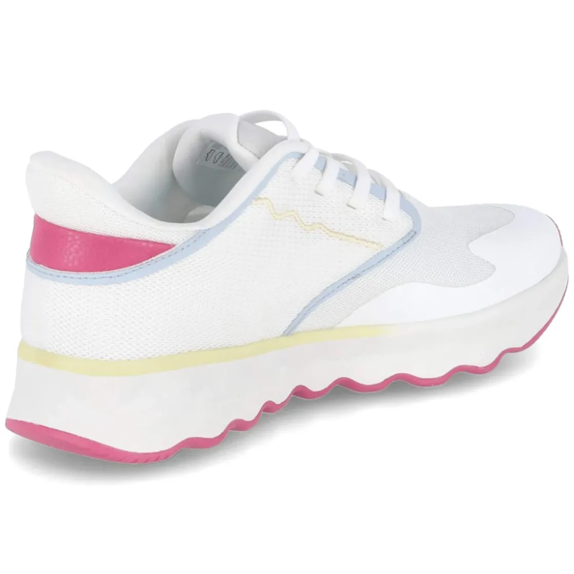 Der weiße Tamaris Sneaker verbindet sportliche Leichtigkeit mit moderner Ästhetik. Das Obermaterial aus Textil und Synthetik zeigt eine glatte, pflegeleichte Oberfläche, akzentuiert durch ein elastisches Band in Schnüroptik sowie dezente Highlights in Blau, Gelb und Rosa. Die runde Schuhspitze und das geringe Gewicht sorgen für ein angenehmes Tragegefühl, während die flexible, rutschhemmende Laufsohle zuverlässigen Halt auf verschiedenen Untergründen bietet. Innen verwöhnt ein gepolstertes, herausnehmbares Fußbett in Textil die Füße; der Schnitt fällt normal aus und erleichtert die Größenauswahl. Der Slip-on-Komfort ohne klassischen Verschluss macht den Alltag unkompliziert. Die Herstellung aus veganen Materialien unterstreicht den bewussten Anspruch der Marke, ohne Kompromisse beim Stil einzugehen. Modetipp: Zu Cropped-Jeans und einem cleanen Hemdblusenkleid entsteht ein frischer City-Look, den eine strukturierte Mini-Bag harmonisch abrundet.