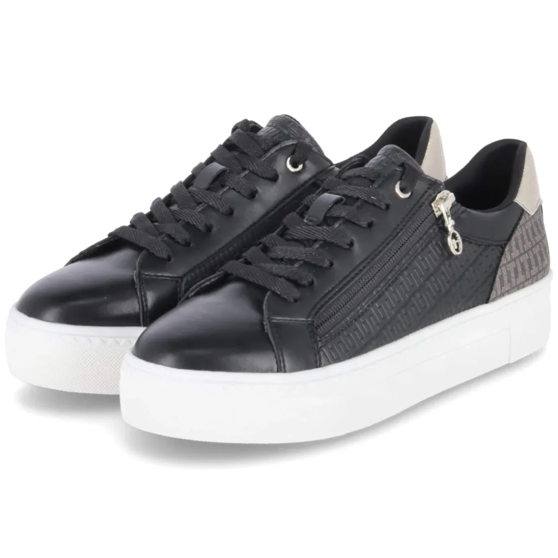 Der schwarze Sneaker von Tamaris vereint sportliche Lässigkeit und detailverliebtes Design. Vegane Materialien treffen auf ein Obermaterial aus Textil und Synthetik, das mit feinem Markenmuster und goldfarbenen Akzenten punktet. Die runde Schuhspitze sorgt für eine feminine Silhouette, während die 4 cm hohe Plateau-Sohle subtil streckt und dank rutschhemmender Profilierung sicheren Halt gibt. Schnürsenkel und zusätzlicher Reißverschluss erleichtern den Einstieg, der leicht gepolsterte Schaft und das gepolsterte Wechselfußbett aus Textil bieten Komfort im Alltag. Der verstärkte Fersenbereich gibt Stabilität, Markendetails runden den Stil ab. Der Größenhinweis fällt normal aus und erleichtert die Wahl. Modetipp: Für einen modernen City-Look zu cropped Straight-Jeans, weißem Hemd und einem schwarzen Blazer kombinieren; goldene Creolen greifen die Akzente auf.