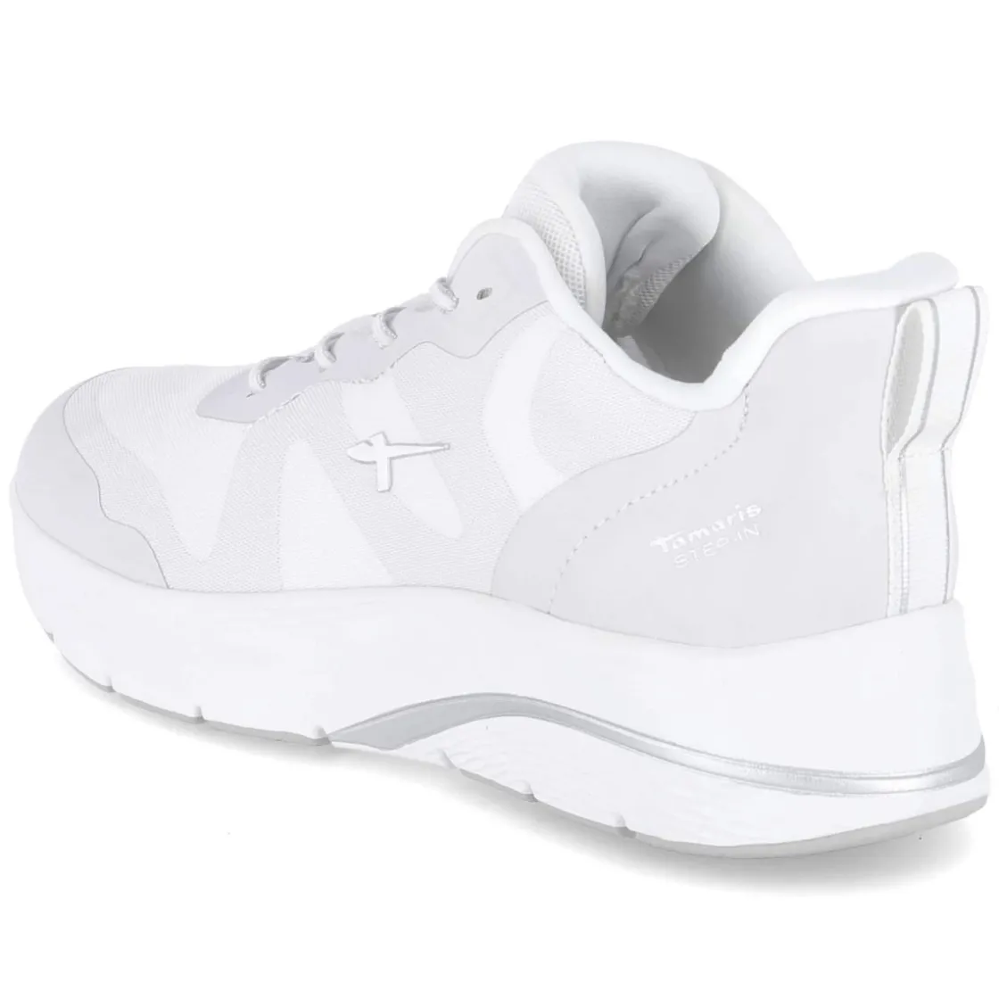 Der weiße Damen-Sneaker von Tamaris setzt auf eine klare, moderne Linienführung und trägt sich dank kluger Materialmischung besonders angenehm. Obermaterial aus Textil und Synthetik schmiegt sich leicht an, während ein Elastikband in Schnüroptik für den lässigen Look sorgt und das Hineinschlüpfen ohne Verschluss erleichtert. Eine textile Decksohle und das komfortable, herausnehmbare Wechselfußbett bieten weiche Dämpfung im Alltag. Verstärkter Zehen- und Fersenbereich erhöht die Formstabilität, die runde Spitze schafft Bewegungsfreiheit. Silberne Akzente setzen dezente Highlights, die flexible, rutschfeste Laufsohle gibt sicheren Halt. Passform fällt normal aus. Gefertigt aus veganen Materialien. Modetipp: Besonders stimmig wirkt das Modell zu hellen Denim-Looks und einem luftigen Stricktop.