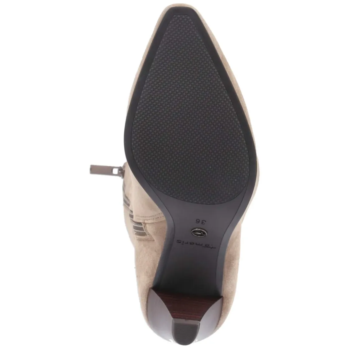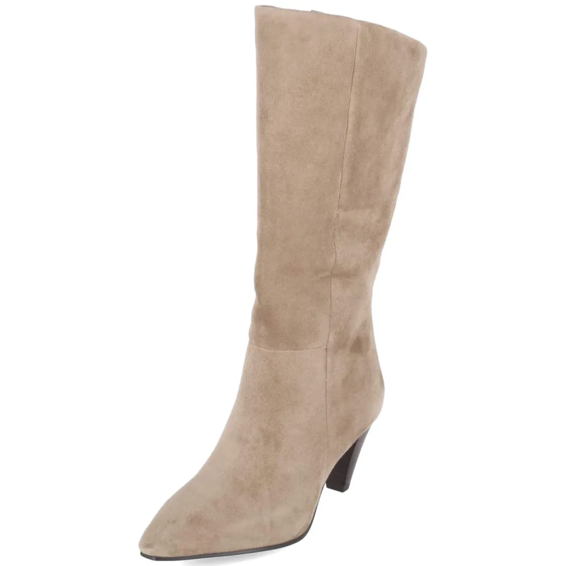 Eleganter Damen-Stiefel von Tamaris in zeitlosem Beige, gefertigt aus hochwertigem Rauleder mit samtiger Oberfläche. Die spitze Schuhspitze und der 7 cm hohe Trichterabsatz mit Absatz in Holzoptik verleihen eine gestreckte Silhouette, während das gepolsterte Fußbett und die textile Decksohle angenehmen Komfort bieten. Ein praktischer Reißverschluss und der kleine Elastikeinsatz am oberen Schaft erleichtern den Einstieg und sorgen gemeinsam mit der flexiblen Laufsohle für entspanntes Gehen im Alltag. Der Schaft misst ca. 37 cm in der Höhe bei etwa 34 cm Umfang; die Passform fällt normal aus. Dieser Stiefel ergänzt sowohl cleane Office-Looks als auch feminine Ausgeh-Outfits und bleibt dank zurückhaltender Farbgebung vielseitig kombinierbar. Modetipp: Ton-in-Ton zu einer cremefarbenen Wollhose und einem Camel-Mantel tragen, dazu feiner Schmuck für ein edles Gesamtbild.