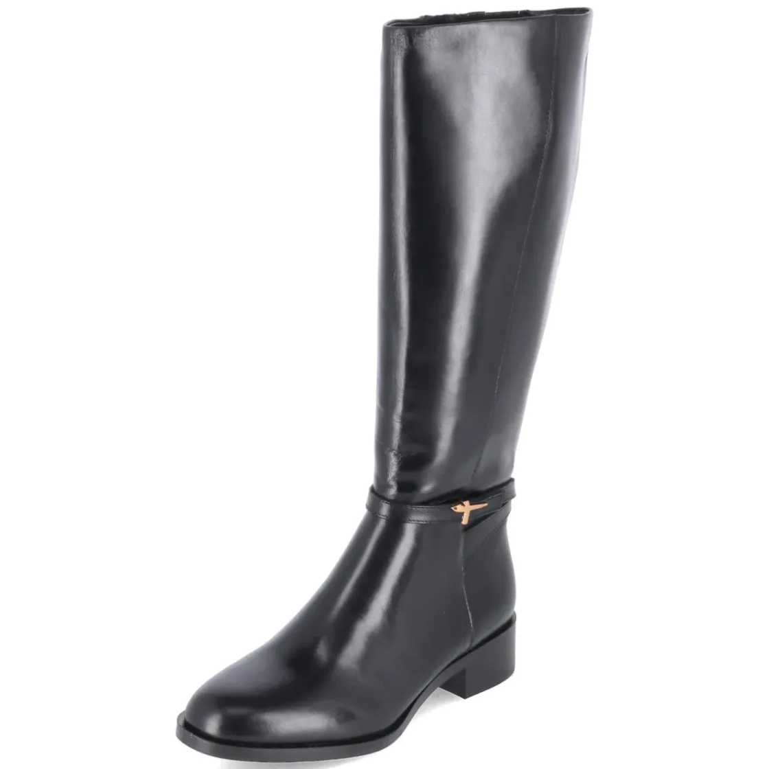 Dieser Damen-Stiefel von Tamaris vereint zeitlose Optik mit funktionalen Details. Schwarzes Glattleder in langlebiger Qualität trifft auf eine runde Spitze und einen 4 cm hohen Blockabsatz, der Stabilität und einen sicheren Auftritt bietet. Das gepolsterte Fußbett und die textile Decksohle sorgen für angenehmen Komfort, während die flexible, rutschfeste Laufsohle bei jedem Schritt unterstützt. Dank praktischem Reißverschluss gelingt das An- und Ausziehen mühelos; der Schaft misst ca. 38 cm in der Höhe und ca. 36 cm im Umfang. Ein Knöchelriemen mit goldenem Logo setzt einen edlen Akzent. Der Stiefel fällt normal aus und lässt sich vielseitig kombinieren – von Office bis Freizeit. Modetipp: Besonders stimmig zu Midikleid und langem Wollmantel, dazu eine strukturierte Ledertasche für einen ausgeglichenen Look.