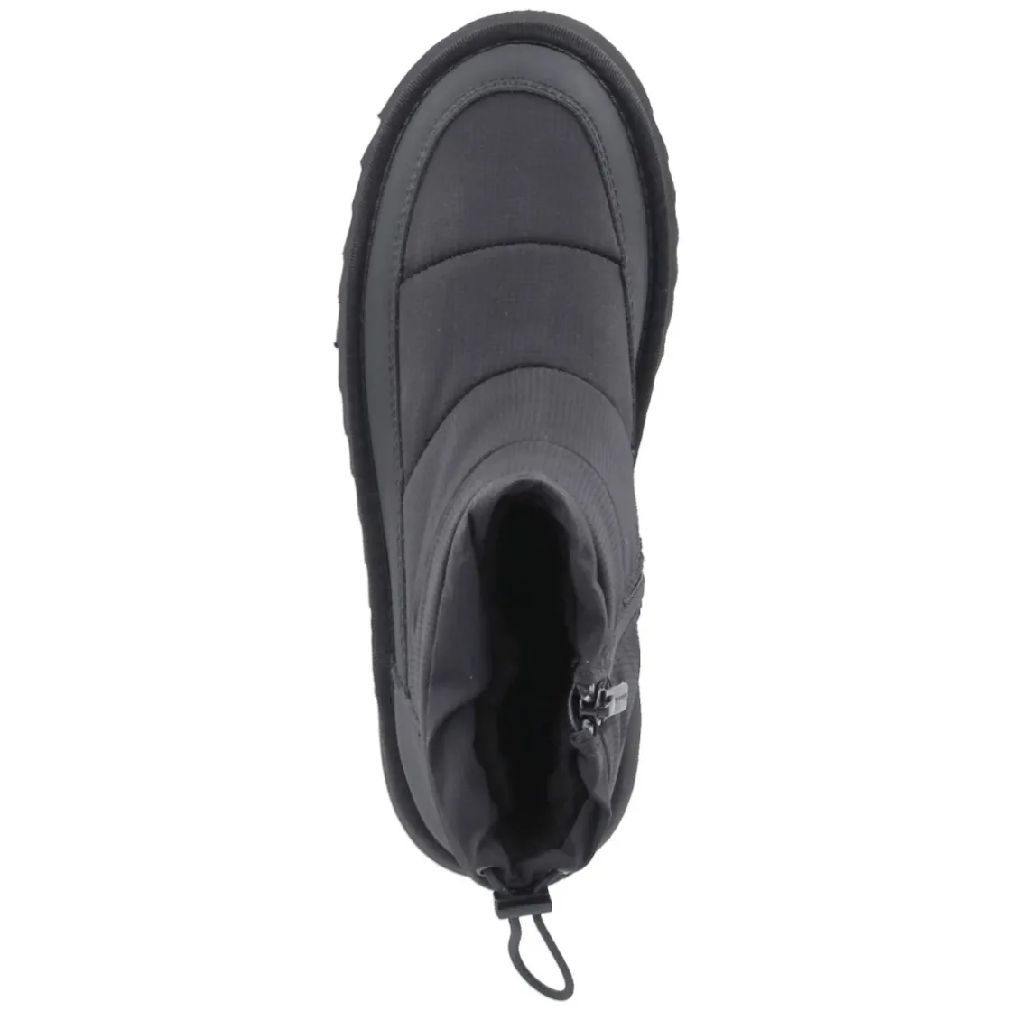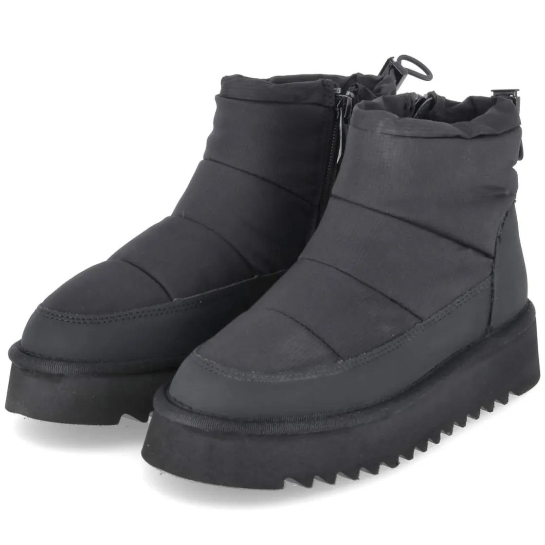 Die Tamaris Winterboots in Schwarz verbinden retroinspiriertes Snowboot-Design mit zeitgemäßem Komfort. Die matte Quersteppoberfläche trifft auf einen weichen Schaft mit Gummizug und Schnellverschluss, während der seitliche Reißverschluss ein müheloses Hineinschlüpfen ermöglicht. Warmfutter und eine textile Decksohle umhüllen den Fuß angenehm, der verstärkte Fußrahmen gibt Stabilität im Alltag. Die runde Spitze und das Obermaterial aus Textil und Synthetik sorgen für ein angenehmes Tragegefühl, die pflegeleichte Oberfläche erleichtert die Handhabung. Mit 3,5 cm Plateauhöhe und einer dicken, leichten Sohle entsteht ein moderner Look, der zugleich Schutz vor Bodenkälte bietet. Der Schnitt fällt normal aus und eignet sich für vielfältige Winter-Outfits. Modetipp: Mit Pufferjacke, gerippten Wollstrümpfen und verkürzter Straight-Leg-Jeans entsteht ein urbane Silhouette, die das voluminöse Schaftdesign souverän ausbalanciert.