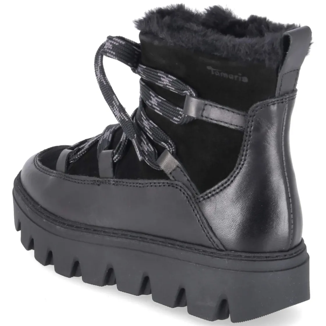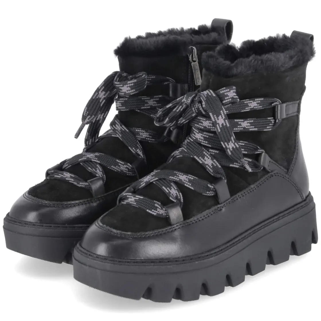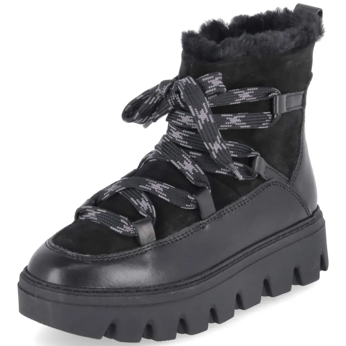 Die Winterboots von Tamaris in zeitlosem Schwarz verbinden Funktion und Stil. Robustes Echtleder im Ledermix umschließt den Fuß, während ein verstärkter Rahmen zusätzlichen Halt gibt. Innen sorgt Warmfutter für wohlige Wärme an kalten Tagen, ergänzt durch ein weich gepolstertes Fußbett und eine angenehme Textildecksohle. Der praktische Mix aus Schnürung und seitlichem Reißverschluss ermöglicht einen bequemen Einstieg und sicheren Sitz. Die runde Spitze bietet Zehenfreiheit, die starke, rutschfeste Profilsohle gibt Stabilität auf glatten Wegen. Der Schnitt fällt normal aus und passt damit verlässlich zur gewohnten Größe. Ein alltagstauglicher Begleiter für Erwachsene, der Komfort und Trittsicherheit vereint. Modetipp: Mit Wollmantel, Strickkleid und blickdichter Thermostrumpfhose entsteht ein urbaner Winter-Look mit femininer Note.