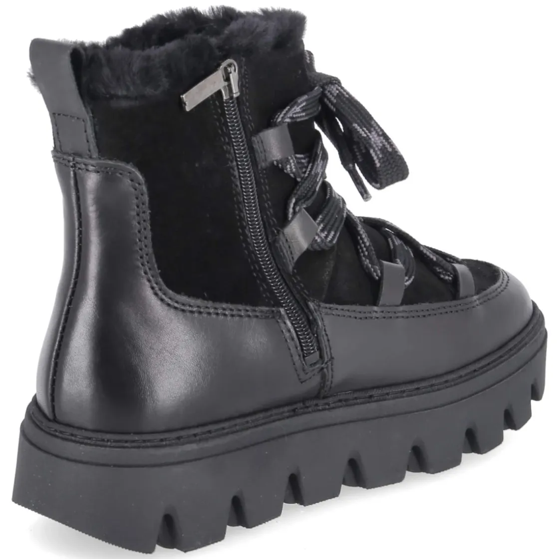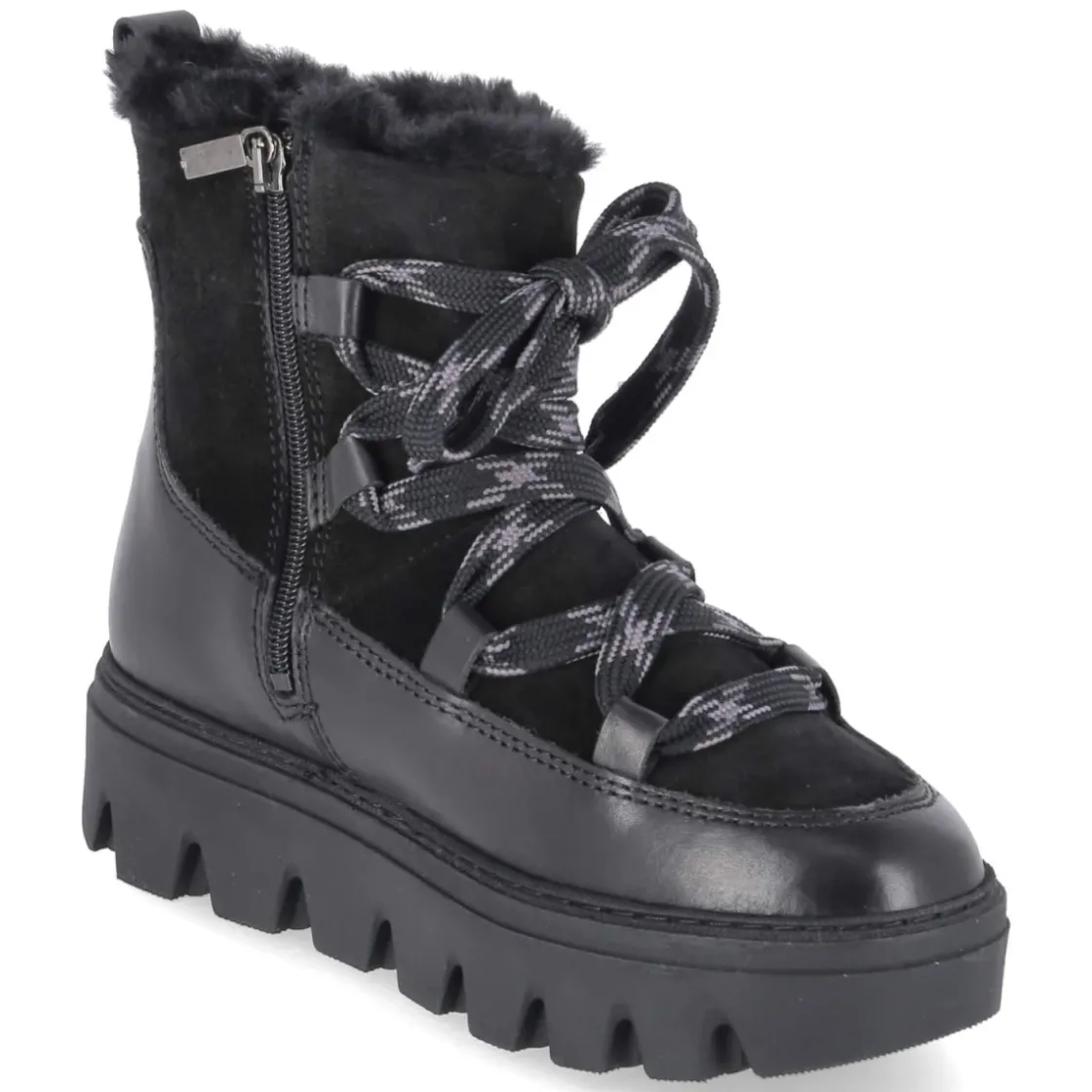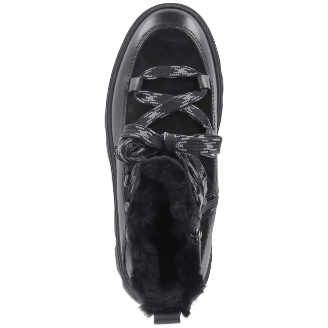 Die Winterboots von Tamaris in zeitlosem Schwarz verbinden Funktion und Stil. Robustes Echtleder im Ledermix umschließt den Fuß, während ein verstärkter Rahmen zusätzlichen Halt gibt. Innen sorgt Warmfutter für wohlige Wärme an kalten Tagen, ergänzt durch ein weich gepolstertes Fußbett und eine angenehme Textildecksohle. Der praktische Mix aus Schnürung und seitlichem Reißverschluss ermöglicht einen bequemen Einstieg und sicheren Sitz. Die runde Spitze bietet Zehenfreiheit, die starke, rutschfeste Profilsohle gibt Stabilität auf glatten Wegen. Der Schnitt fällt normal aus und passt damit verlässlich zur gewohnten Größe. Ein alltagstauglicher Begleiter für Erwachsene, der Komfort und Trittsicherheit vereint. Modetipp: Mit Wollmantel, Strickkleid und blickdichter Thermostrumpfhose entsteht ein urbaner Winter-Look mit femininer Note.