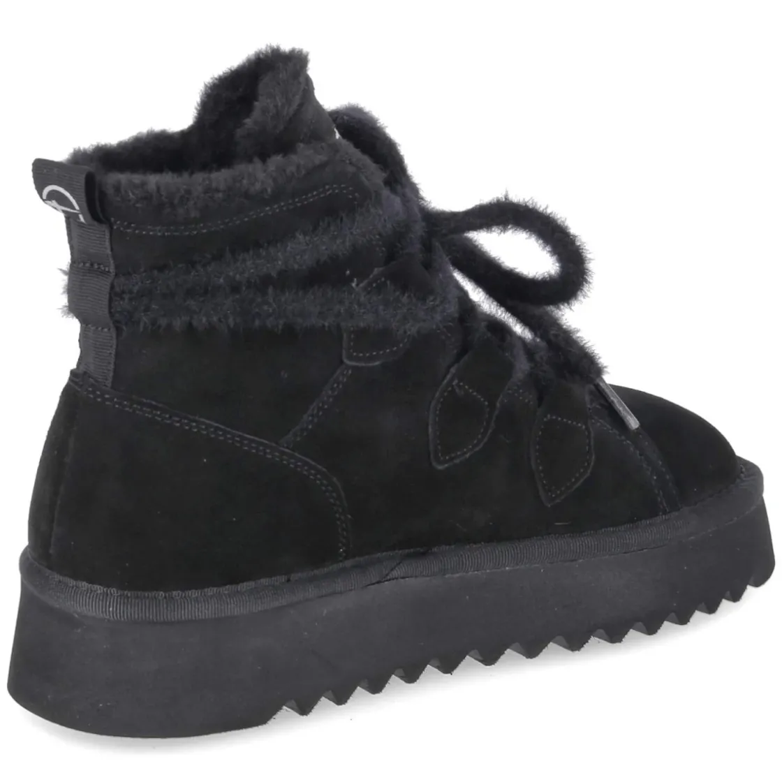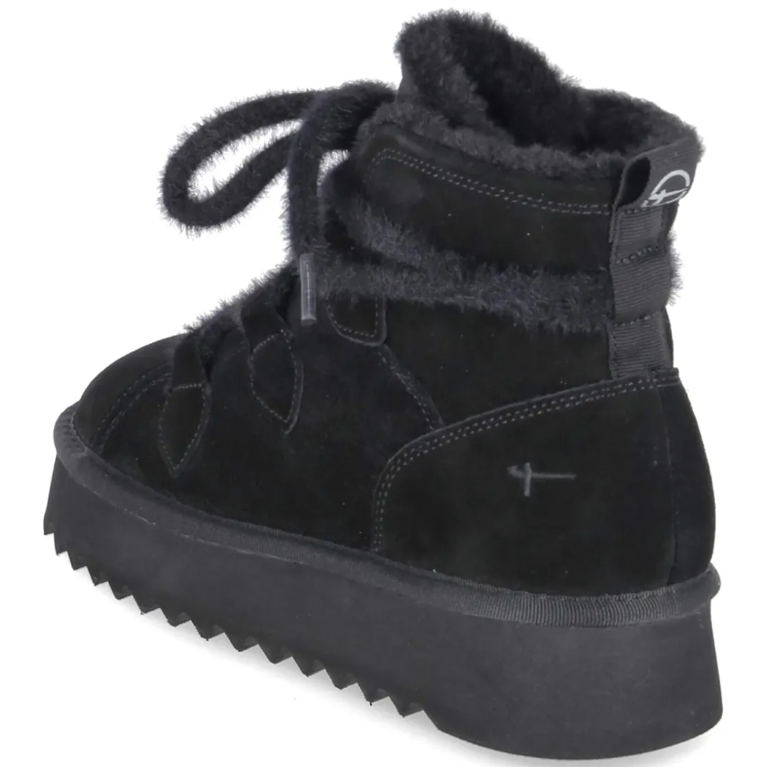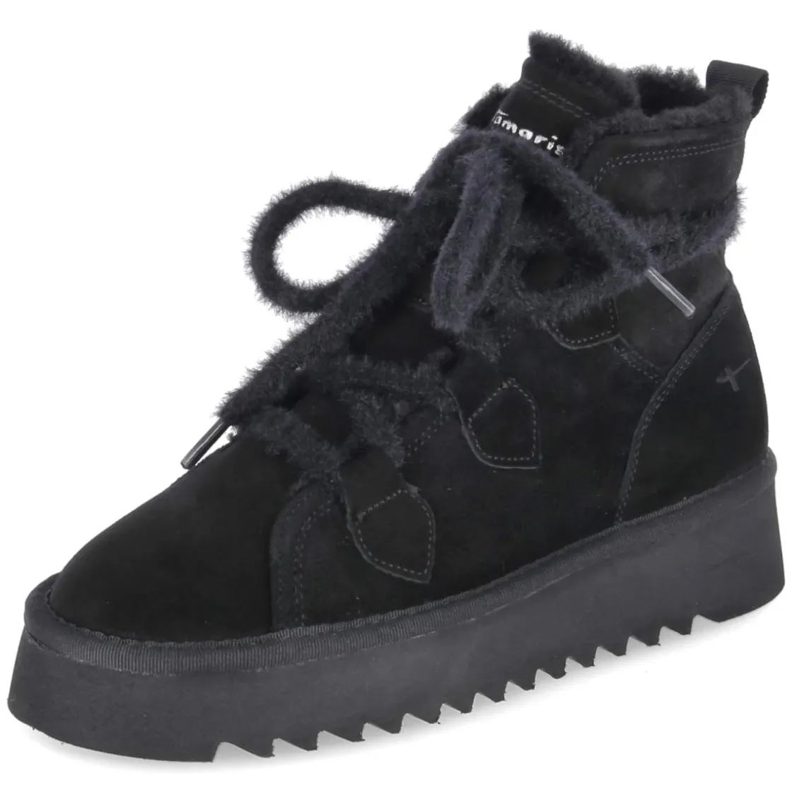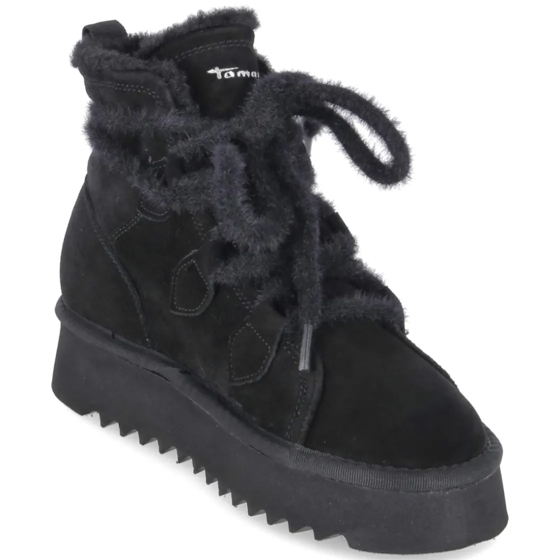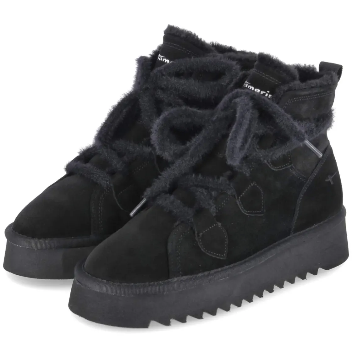 Dieser Winterboot von Tamaris für Damen verbindet urbane Lässigkeit mit funktionaler Wärme. Schwarzes Rauleder in langlebiger Echtleder-Qualität trifft auf ein kuschliges Warmfutter, das an kalten Tagen zuverlässig schützt. Die runde Spitze und die flauschige Schnürung sorgen für eine weiche Linienführung, während die verstärkte Ferse Stabilität gibt. Das gepolsterte Fußbett und die textile Decksohle bieten sanfte Dämpfung, das relaxt leichte Tragegefühl entlastet auf langen Wegen. Mit 3,5 cm Plateauabsatz und einer Plateausohle mit leichtem Profil entsteht ein solider Stand und dezente Höhe. Der Schuh fällt normal aus und passt damit unkompliziert in die Alltagsgarderobe. Modetipp: Zu einem Wollmantel in Camel, Strickkleid und blickdichten Strümpfen entsteht ein zeitloser Winterlook; ein schwarzer Oversize-Schal hebt die samtige Struktur des Rauleders hervor.