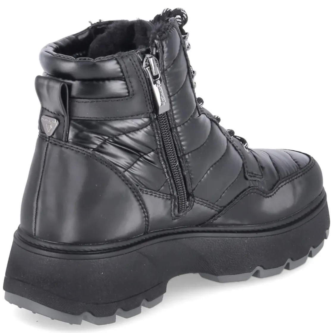 Der Tamaris Wintersneaker in Schwarz verbindet urbanen Look mit verlässlicher Wintertauglichkeit. Das abgesteppt schimmernde Obermaterial aus Textil und Synthetik sorgt für eine elegante Note, während das warme Futter und die gepolsterte Thermoeinlage behagliche Wärme liefern. Eine rutschfeste Profilsohle bietet Grip auf glatten Wegen, der 4 cm hohe Plateau-Absatz verleiht subtile Höhe und Stabilität. Dank Schnürung und zusätzlichem Reißverschluss gelingt der Einstieg unkompliziert, verstärkte Zehen- und Fersenbereiche erhöhen die Robustheit. Die Decksohle aus Textil liegt angenehm am Fuß, das Wechselfußbett ermöglicht individuelle Einlagen. Der Schuh fällt größengetreu aus, die runde Spitze rundet den alltagstauglichen Komfort ab. Besonders hervorzuheben: die Verarbeitung aus veganen Materialien. Modetipp: In Kombination mit weiter Wollhose, langem Mantel und Strickschal entsteht ein cleaner City-Winterlook mit sportivem Akzent.