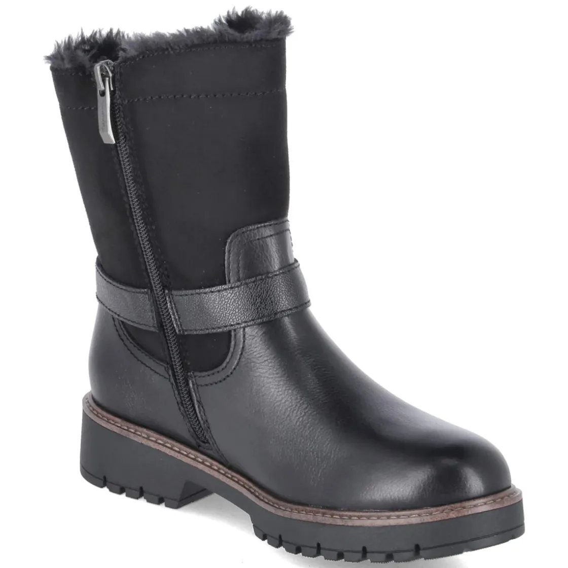 Die Tamaris Winterstiefeletten setzen auf einen modernen Material-Mix aus Synthetik, Leder und Textil und kommen in zeitlosem Schwarz. Das warme Futter umschließt den Fuß angenehm, unterstützt von einer weichen, textilen Decksohle. Ein komfortabler Reißverschluss ermöglicht den schnellen Einstieg, während zwei verstellbare Riemen am samtig-weichen Schaft für individuellen Halt sorgen. Die verstärkte Ferse und die flexible, rutschfeste Profilsohle geben Sicherheit auf glatten Wegen. Mit rund gearbeiteter Spitze, normaler Passform und 4 cm hohem Blockabsatz bleibt der Look feminin und zugleich alltagstauglich. Der Schaft misst ca. 17 cm in der Höhe bei ca. 30 cm Umfang. Modetipp: Besonders stimmig wirkt das Modell zu einer gestrickten Midi-Rippe, dicker Strumpfhose und Wollmantel; für lässige Tage punkten gekrempelte Straight-Jeans und ein voluminöser Steppparka.