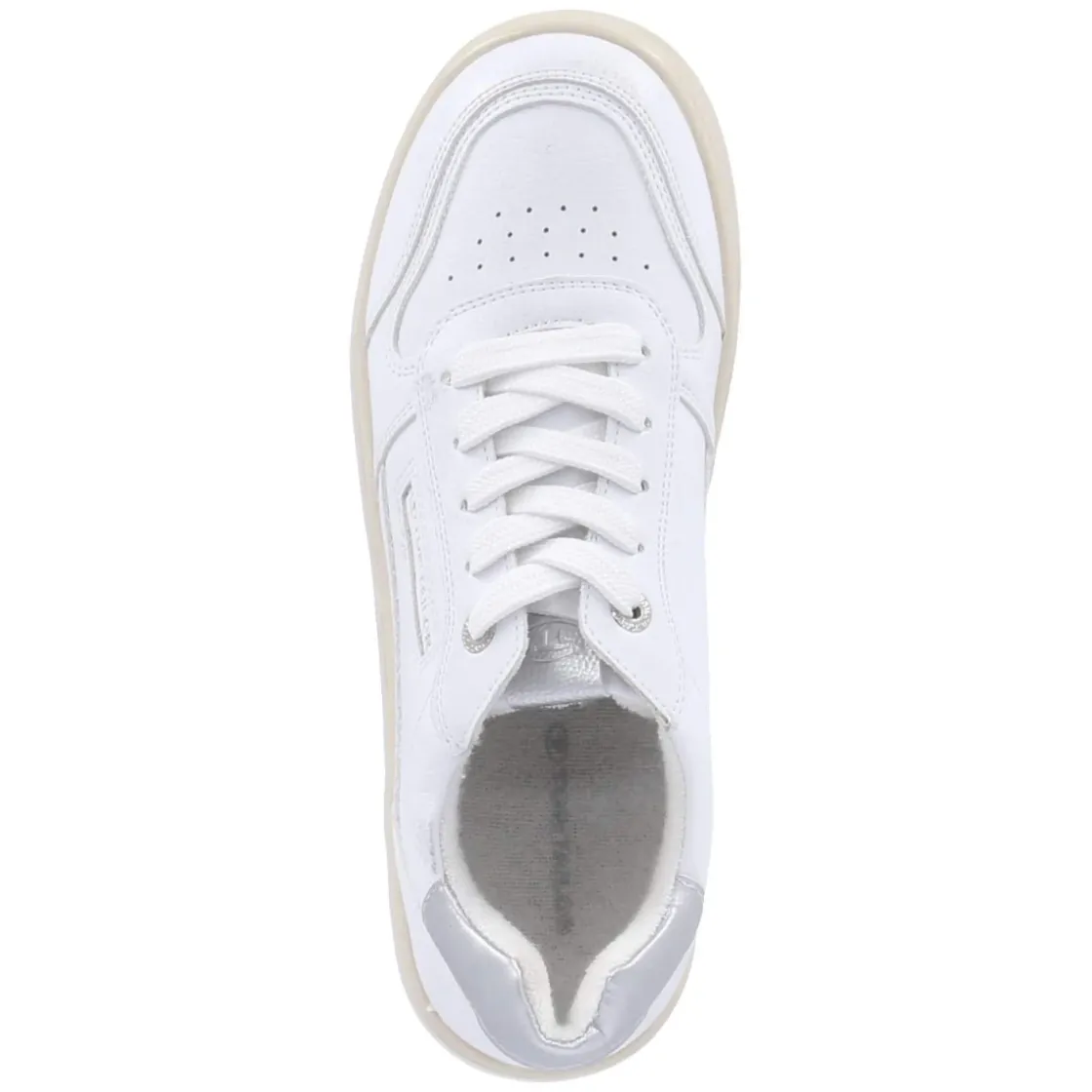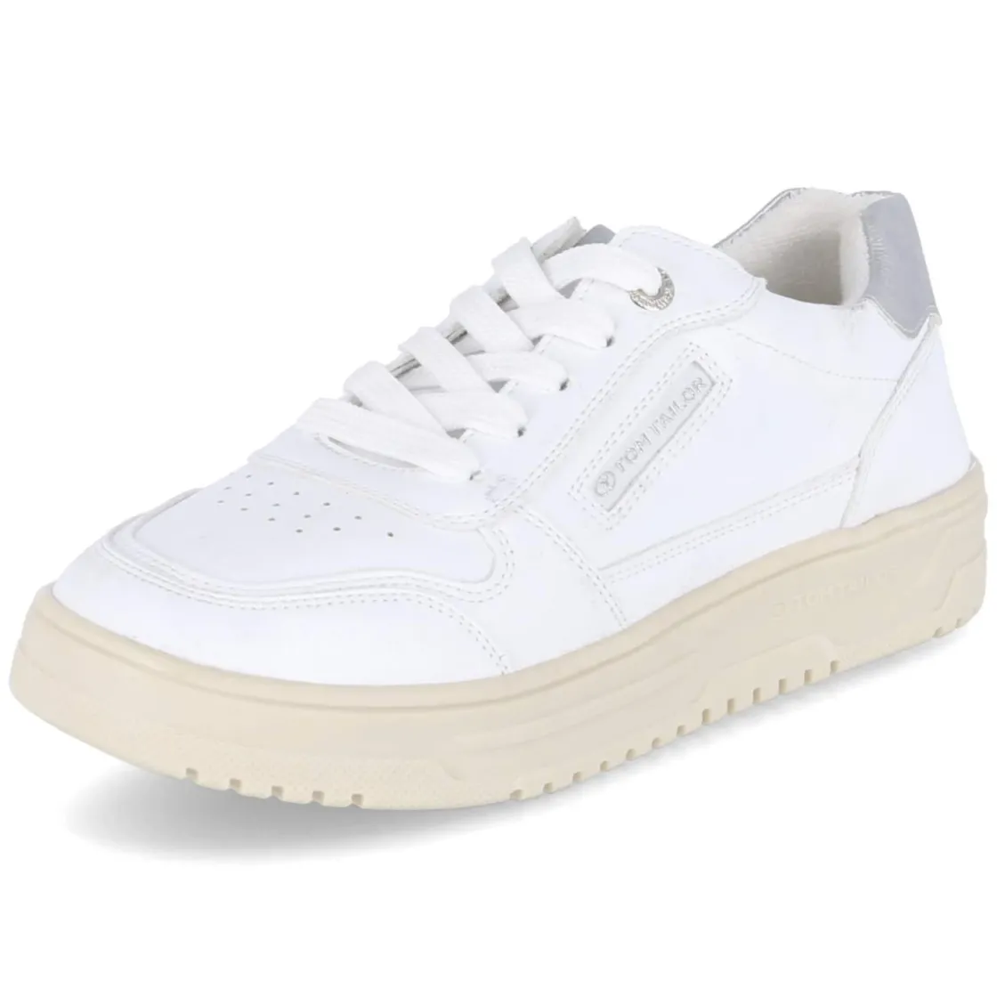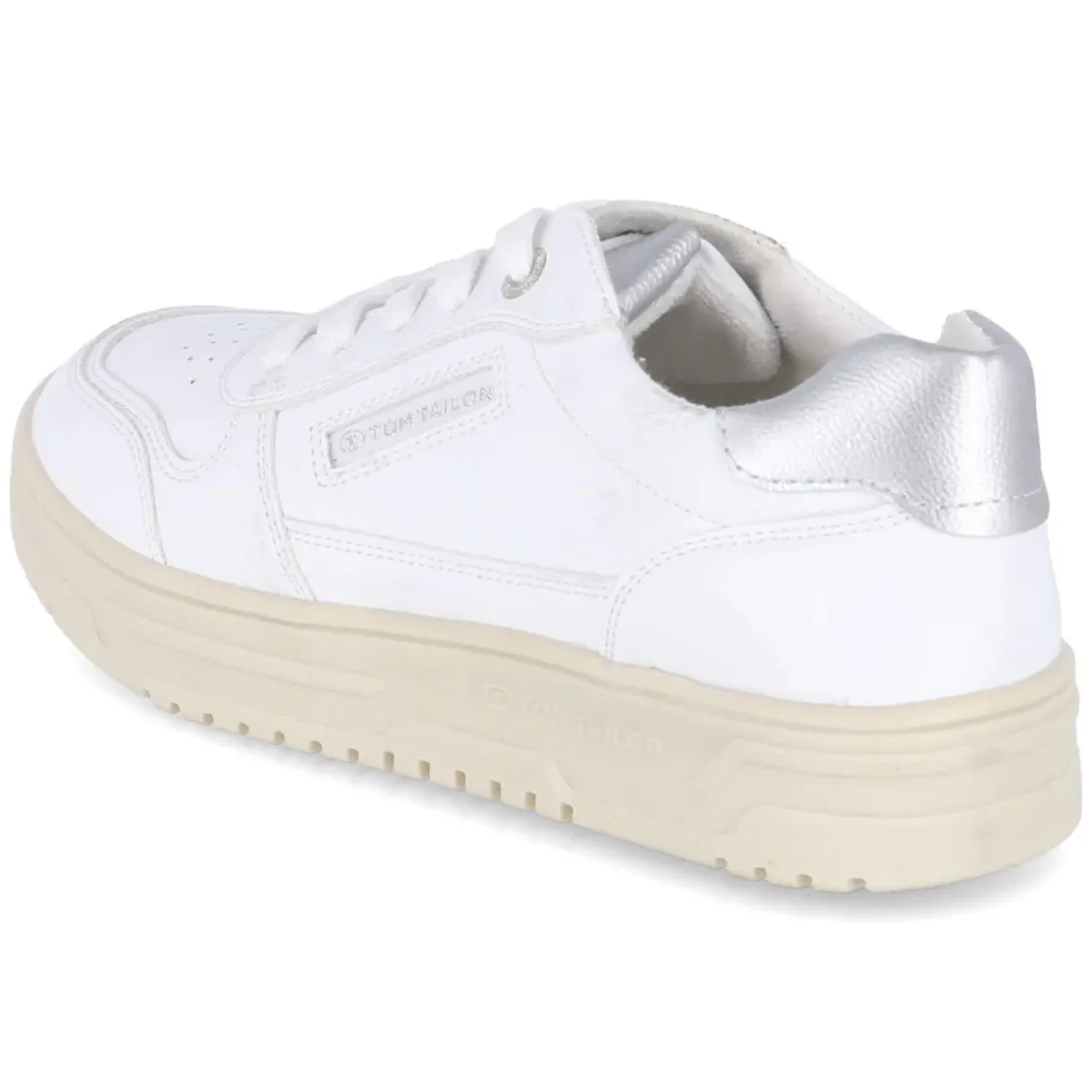 Puristisches Design trifft auf komfortstarke Details: Der weiße Low Sneaker von Tom Tailor für Damen überzeugt mit pflegeleichter Synthetik-Oberfläche und fein gelochtem Schuhdeck, das dem cleanen Look frische Leichtigkeit verleiht. Die runde Schuhspitze und der leicht gepolsterte Einstieg sorgen gemeinsam mit dem verstärkten Fersenbereich für angenehmen Halt. Innen bietet ein textiles Futter behagliches Klima, während das herausnehmbare Memory-Foam-Wechselfußbett die Schritte sanft abfedert. Eine flexible, rutschhemmende Cupsohle macht ihn zum verlässlichen Alltagsbegleiter. Silbern glänzende Highlights und dezente Markendetails setzen moderne Akzente. Der Schnitt fällt normal aus und lässt sich mühelos kombinieren – vom City-Trip bis zum Casual Friday. Modetipp: Mit Cropped-Jeans, gestreiftem Shirt und leichtem Trench entsteht ein zeitloser, urbaner Look.