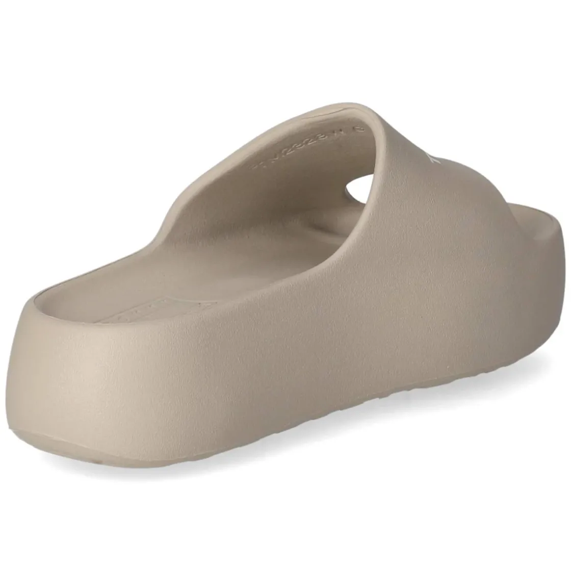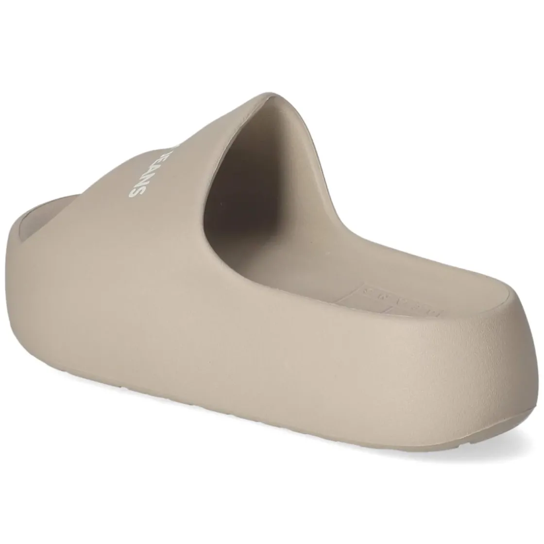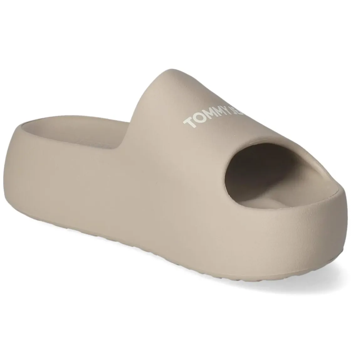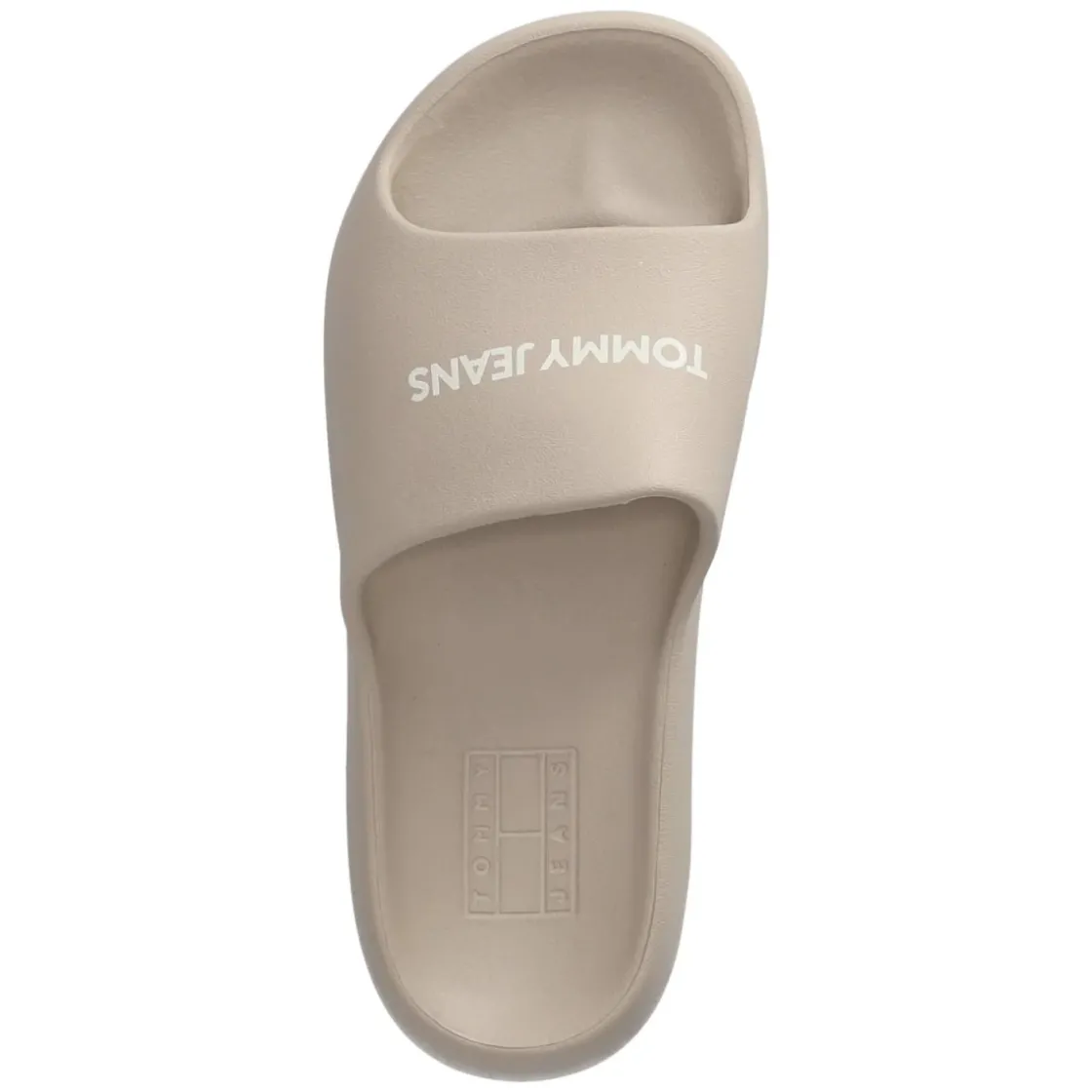 Die Pantoletten von Tommy Jeans verbinden moderne Optik mit unkompliziertem Komfort. Das taupefarbene Synthetik-Obermaterial zeigt sich mit breitem Riemen über dem Spann und dezenten Markendetails, die den cleanen Look unterstreichen. Ein leicht gepolstertes, vorgeformtes Fußbett aus Synthetik sorgt den ganzen Tag über für angenehme Dämpfung, während die flexible Plateaulaufsohle mit leichtem Profil sicheren Halt gibt. Der 5,5 cm hohe Plateauabsatz streckt subtil und bleibt dabei angenehm stabil. Dank rund zulaufender Schuhspitze und schlupffreundlichem Design lässt sich das Modell mühelos tragen und fällt normal aus. Ideal für warme Tage und City-Looks, wenn Funktion und Style gleichermaßen gefragt sind. Modetipp: Besonders stimmig zu Midikleidern in Naturtönen oder locker geschnittenen Leinenhosen; ein goldfarbenes Fußkettchen setzt einen frischen Akzent.