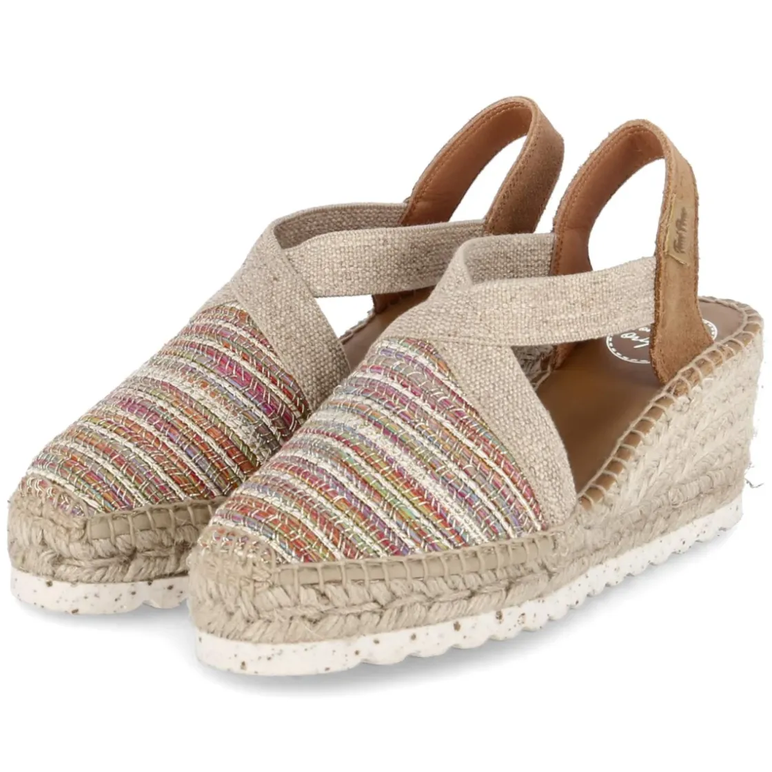 Die Keilsandaletten TERRA von Toni Pons vereinen sommerliche Leichtigkeit mit einem glitzernden Finish. Feine Streifen mit metallischem Glanz sorgen für lebhafte Bewegung, während das mehrfarbige Obermaterial aus Textil dem Look eine frische Note gibt. Der 6,5 cm hohe Keilabsatz bietet angenehme Höhe bei sicherem Stand, die runde Spitze wirkt feminin und zeitlos. Gekreuzte, elastische Riemen über dem Spann ersetzen den Verschluss und ermöglichen bequemes Hineinschlüpfen. Die hautfreundliche Lederdecksohle schmiegt sich sanft an und unterstreicht den hohen Tragekomfort. Der geflochtene Sohlenrahmen erinnert an mediterrane Espadrille-Details und lässt vielfältige Styling-Optionen zu. Das Modell fällt normal aus und überzeugt mit ausgezeichneten Kombinationsmöglichkeiten für Alltag und besondere Anlässe. Modetipp: Zu einfarbigem Midikleid und Korbtasche kommen Streifen und Glanz besonders elegant zur Geltung.