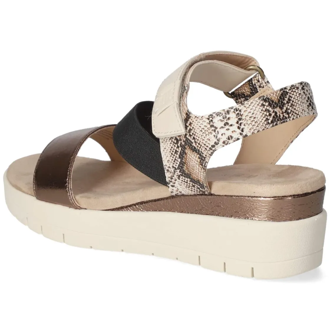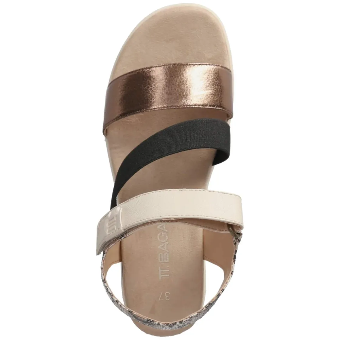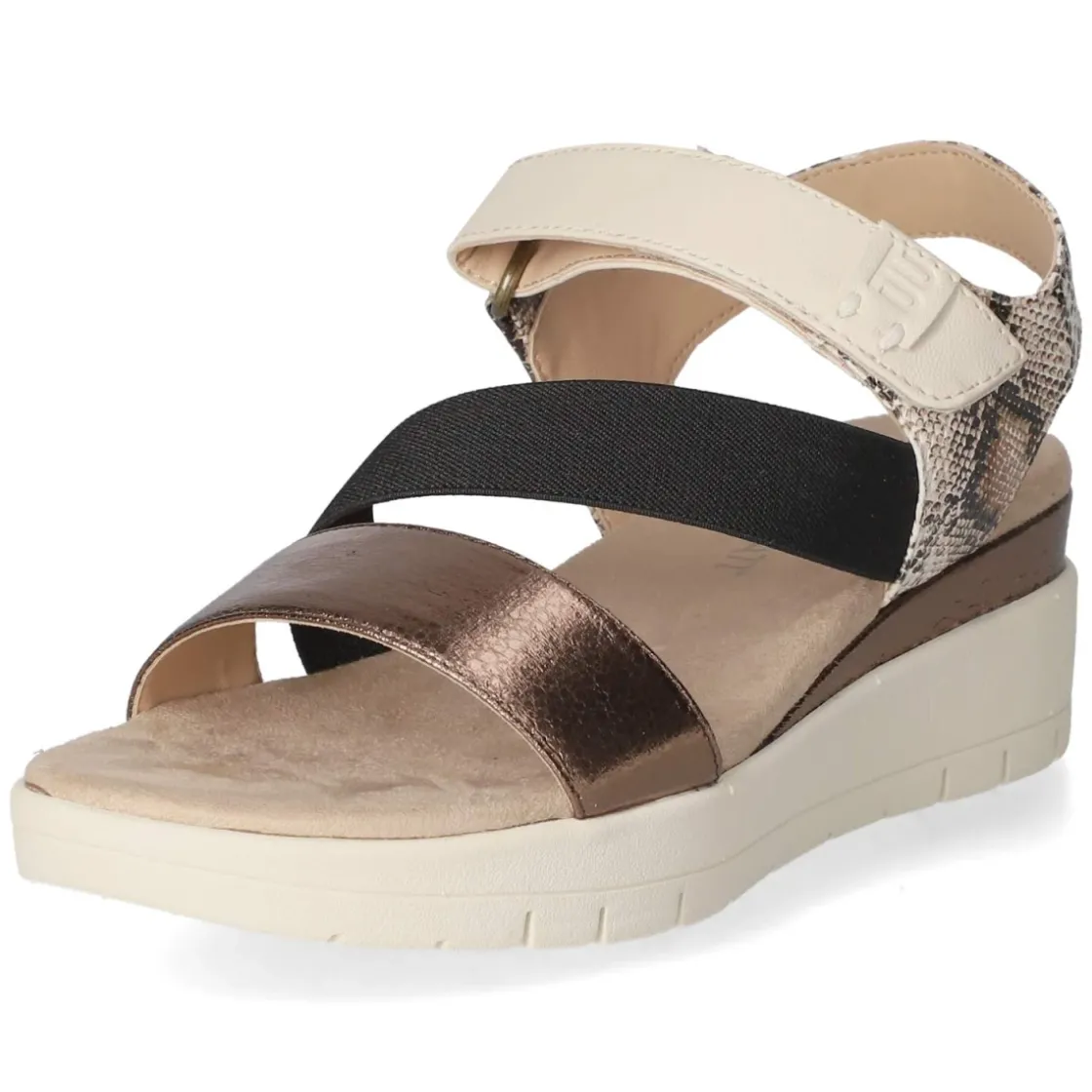 TT.Bagatt präsentiert mit dem Modell SENAY eine moderne Sandalette, die Komfort und Charakter vereint. Der 5-cm-Keilabsatz streckt subtil und bleibt dank seiner stabilen Form ganztägig angenehm. Der leichte Mix aus Textil und Synthetik schmeichelt dem Fuß, während die textile Decksohle und das weich gepolsterte Fußbett anschmiegsamen Halt geben. Ein bequemer Klettverschluss ermöglicht schnelle Weitenanpassung, der breite Elastikriemen sorgt für sicheren Sitz. Optische Highlights setzen der vordere Riemen in Bronze und Akzente in Reptiloptik, die dem mehrfarbigen Design eine edle Note verleihen. Die offene Schuhspitze unterstreicht den sommerlichen Look, die Passform fällt normal aus. Modetipp: Zu fließenden Culottes und einem leichten Stricktop entsteht ein urbaner Tageslook; abends ergänzt eine Bast-Clutch den eleganten Schimmer der Bronzetöne.