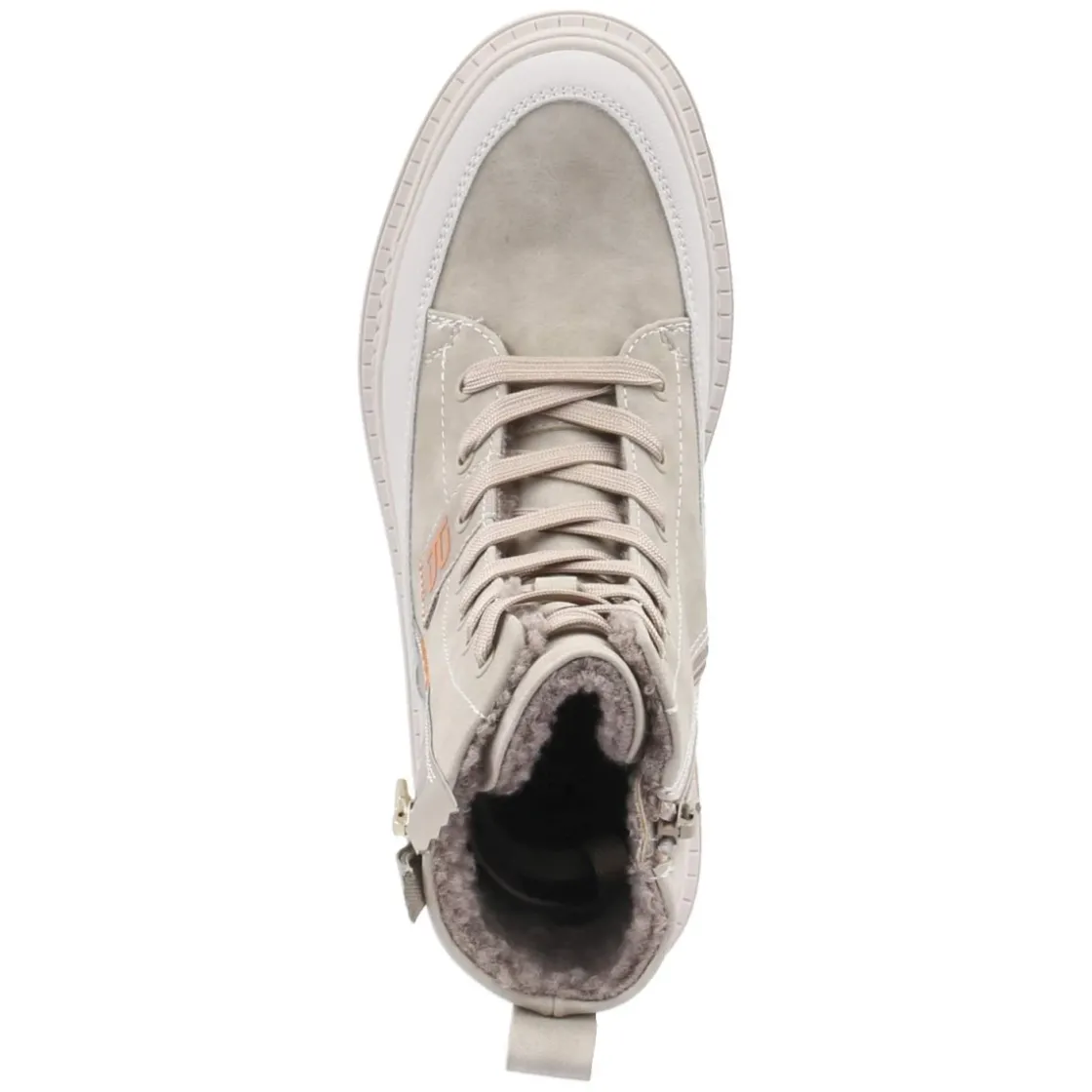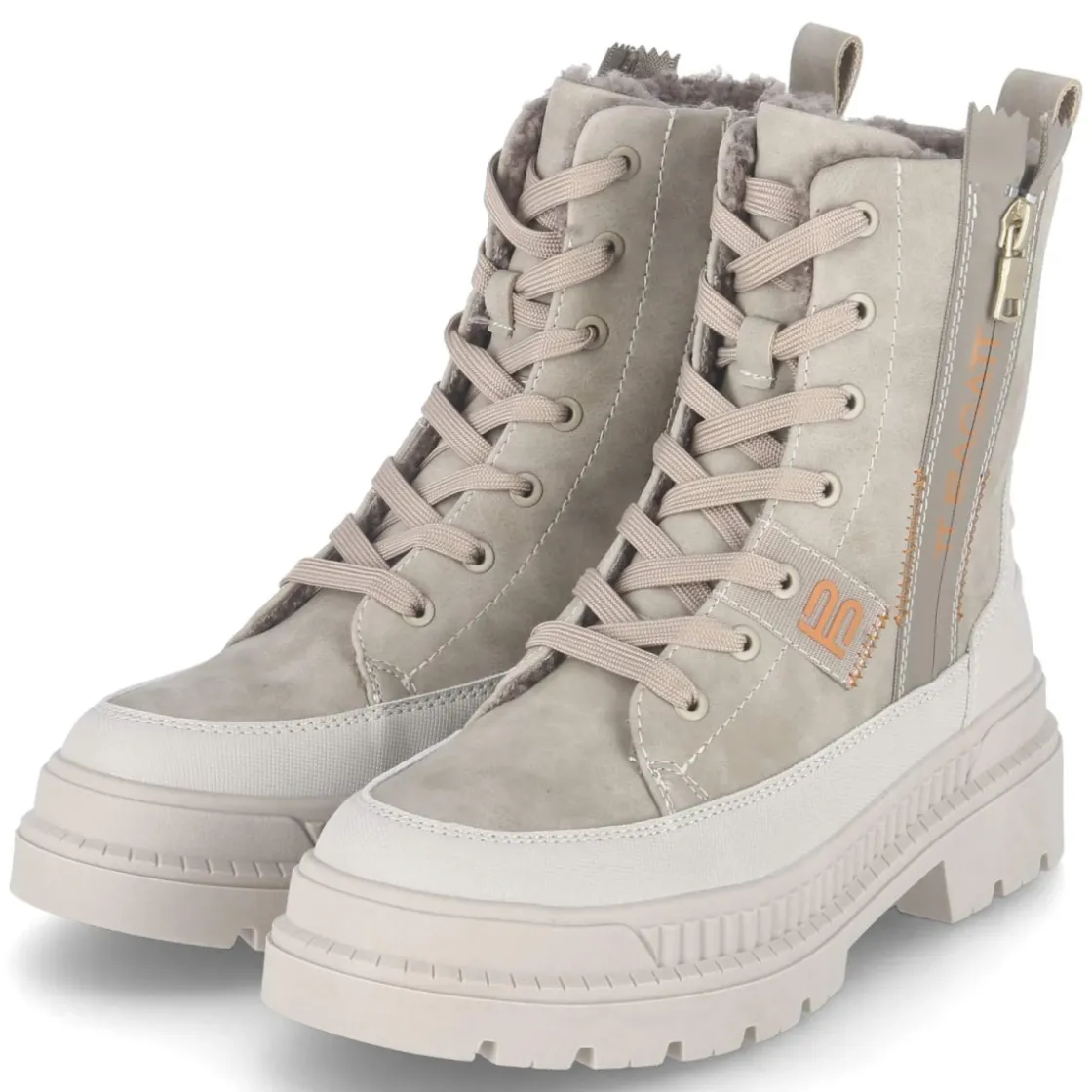 Die Winterboots von TT.Bagatt verbinden wetterfeste Funktion mit moderner Optik in sanftem Beige. Ein 4 cm hoher Blockabsatz und der verstärkte Fußrahmen sorgen für Stabilität, während die rutschfeste Profilsohle auf glatten Wegen greift. Das warme Futter und die textile Decksohle umhüllen den Fuß angenehm, die runde Spitze bietet zusätzlichen Raum. Obermaterial aus pflegeleichtem Synthetik nimmt den Alltag gelassen, Schnürung und seitlicher Reißverschluss ermöglichen schnelles An- und Ausziehen, unterstützt von der Anziehlasche. Orange Markendetails und der Zierreißverschluss an der Außenseite setzen dezente Akzente. Der Schnitt fällt normal aus und begleitet zuverlässig durch kalte Tage. Modetipp: Zu cremefarbenem Strick, wattiertem Parka und gerader Denim getragen entsteht ein ruhiger Winterlook, den die orangefarbenen Details frisch akzentuieren.