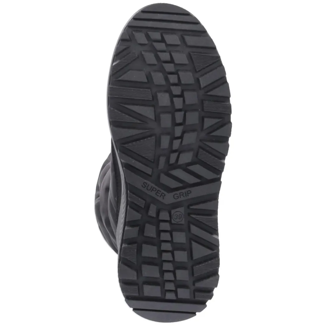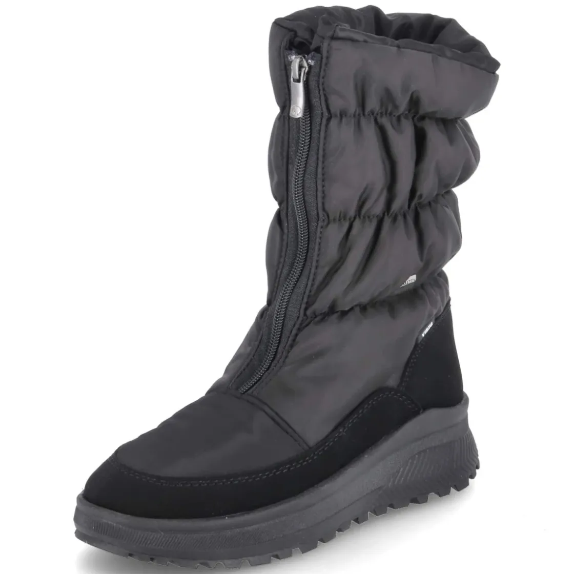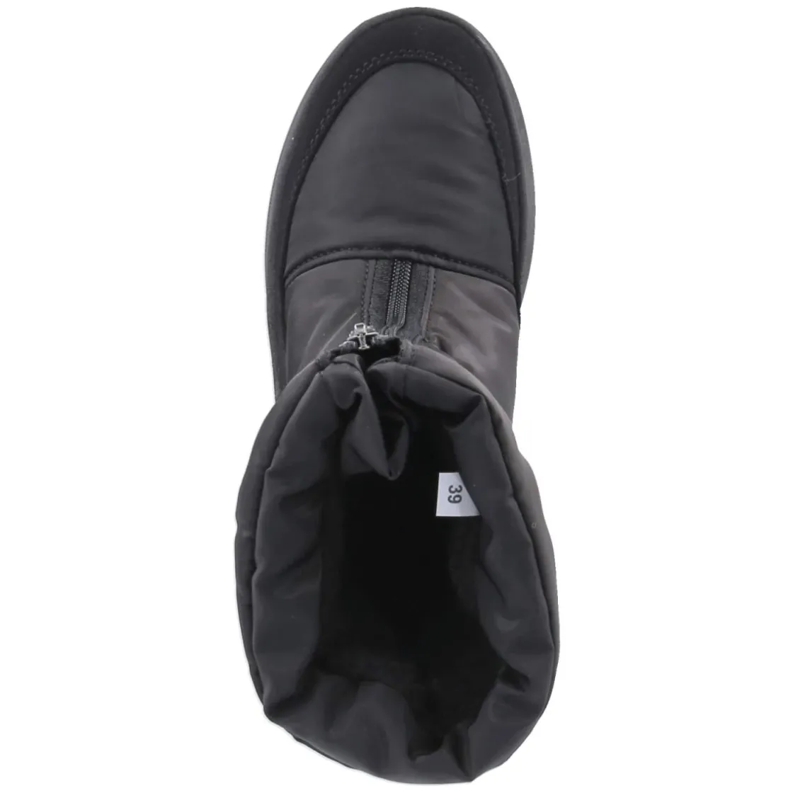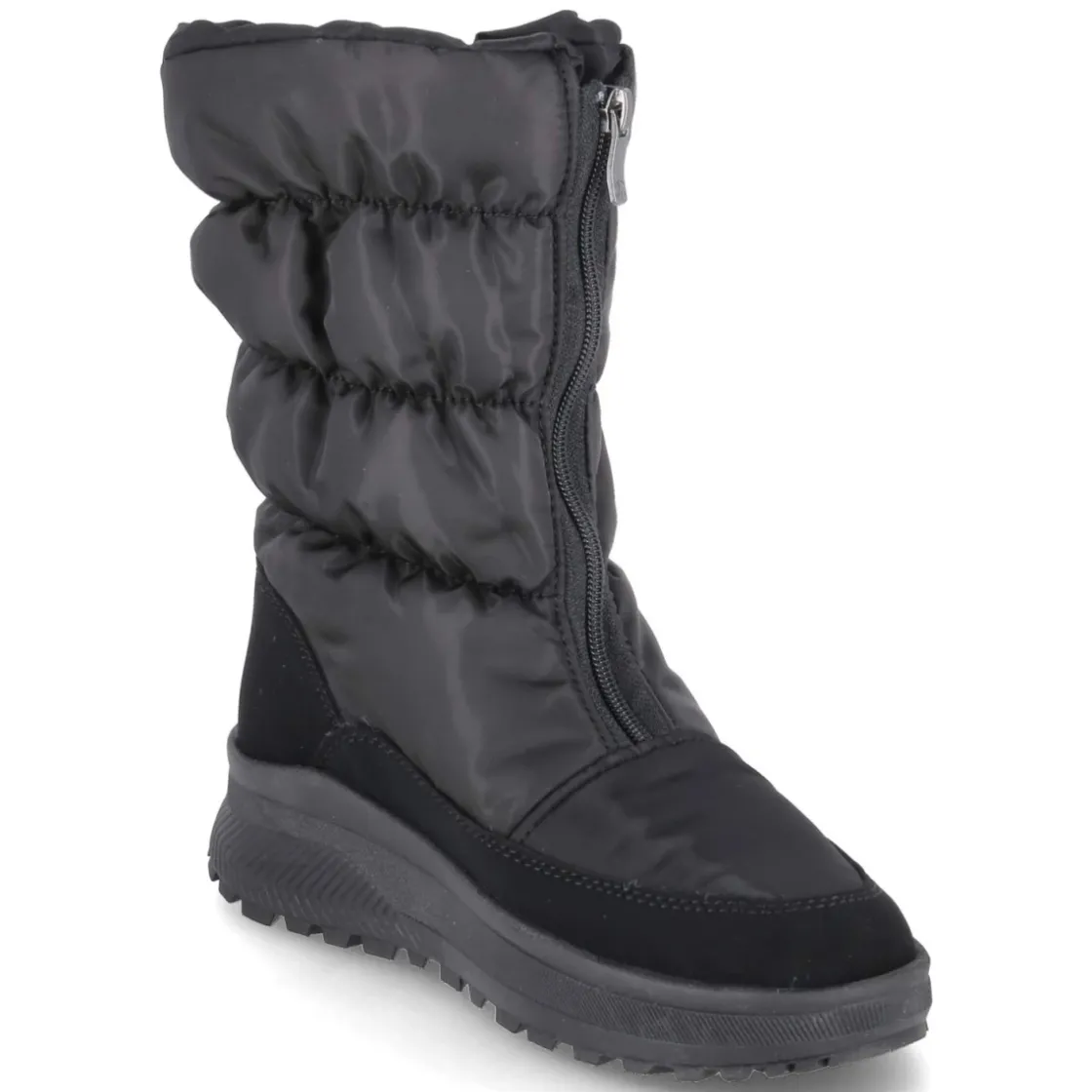 Die schwarzen Snowboots von Vista verbinden verlässlichen Wetterschutz mit klarer Linie. Das Obermaterial aus Textil und Synthetik umschließt einen Schaft mit eleganter Quersteppung; bei ca. 26 cm Höhe und rund 34 cm Umfang sorgt er für angenehmen Halt. Warmfutter schützt an kalten Tagen, während atmungsaktive Eigenschaften ein ausgeglichenes Fußklima unterstützen. Der praktische Reißverschluss ermöglicht schnellen Einstieg, die runde Schuhspitze und die textile Decksohle bieten Komfort im Alltag. Ein verstärkter Fußrahmen stabilisiert, die robuste, rutschhemmende Profilsohle greift sicher auf winterlichen Untergründen. Dank Wechselfußbett lässt sich die Passform individuell anpassen, und die Passform fällt normal aus. Wasserfest konstruiert und wasserabweisend im Detail, sind diese Damen-Boots zuverlässige Begleiter durch Schnee und Matsch. Modetipp: Mit Steppmantel, Thermo-Leggings und grob gestricktem Schal entsteht ein harmonischer Look, der Funktion und Stil mühelos verbindet.