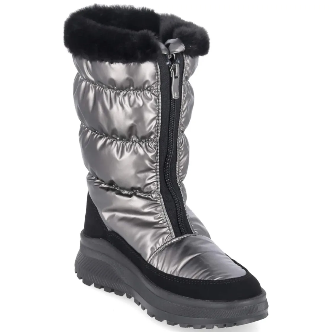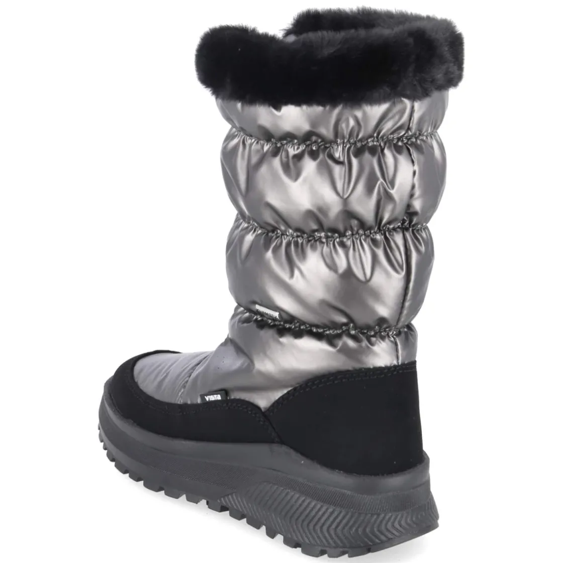 Der Vista Winterstiefel für Damen verbindet Komfort und urbanen Glanz. Die metallisch schimmernde Klimatex-Oberfläche in Silber mit peltro- und Zinn-Nuancen setzt ein Statement, während das warme Futter verlässlich durch kalte Tage begleitet. Der wasserabweisende, wasserfeste Material-Mix schützt zuverlässig, der rund geformte Leisten und der verstärkte Fußrahmen sorgen für ein angenehmes Tragegefühl. Dank Reißverschluss gelingt der Einstieg mühelos. Ein weicher, quer gesteppter Schaft mit Kunstfellkrempe umspielt die Wade, Schafthöhe und -umfang liegen bei ca. 24 x 30 cm. Die textile Decksohle und das relaxtes Leichtgewicht-Gefühl machen lange Wege angenehm, die starke, rutschfeste Profilsohle bietet Halt auf glatten Untergründen. Fällt größengetreu aus. Modetipp: Zu schmalen Denim und einem kuscheligen Oversize-Strickpullover entsteht ein moderner Winterlook mit funkelndem Finish.