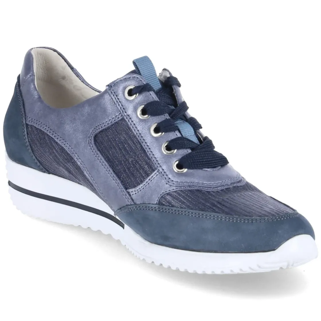 Der Low Sneaker HIMONA von Waldläufer verbindet sportliche Lässigkeit mit durchdachtem Komfort. Das frische Blau erhält durch metallisch glänzende Partien und dezente Streifen einen modernen Akzent, der sowohl zu Casual-Looks als auch zu smarten Freizeit-Outfits passt. Obermaterial und Decksohle aus hochwertigem Echtleder stehen für Langlebigkeit und ein angenehmes Fußklima. Die runde Spitze, der leicht gepolsterte Einstieg sowie die gepolsterte, lederbezogene Wechseldecksohle unterstützen entspanntes Gehen über den ganzen Tag. Für eine individuelle Passform sorgt die Schnürung, während der zusätzliche Reißverschluss das An- und Ausziehen erleichtert. Verstärkte Zehen- und Fersenbereiche geben Stabilität, die flexible, rutschhemmende Profilsohle bietet sicheren Halt. Fällt normal aus und eignet sich für Damen, die Wert auf Komfort legen. Modetipp: Mit Cropped-Jeans, weißem Shirt und silberfarbenen Accessoires entsteht ein cleaner City-Look.