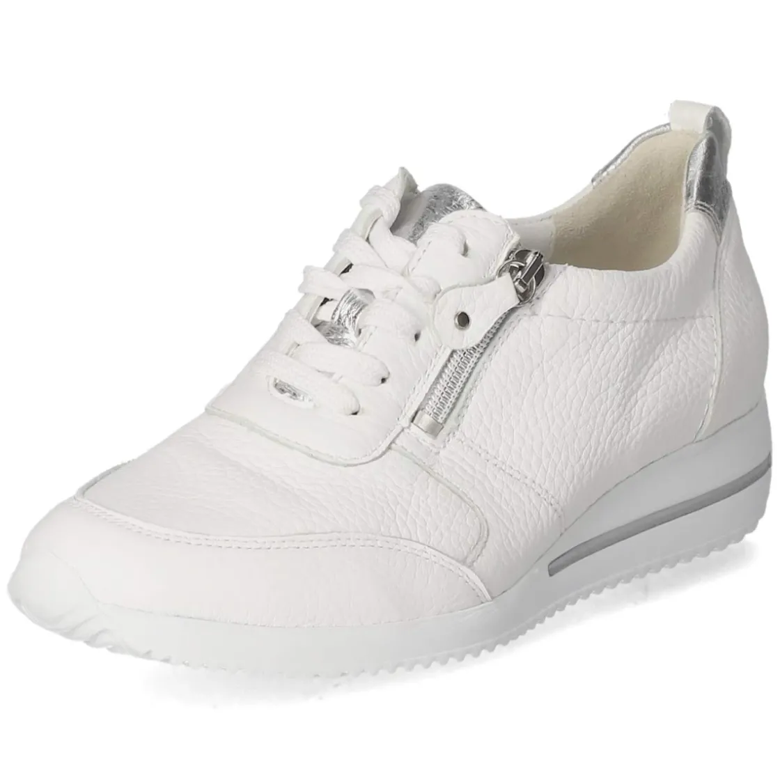 Der Low Sneaker HIMONA von Waldläufer präsentiert sich in klassischem Weiß und verbindet Komfort mit dezentem Glanz. Atmungsaktives Echtleder in glatter Ausführung umschließt den Fuß, die runde Spitze und verstärkte Zehen- und Fersenbereiche sorgen für Schutz und Formstabilität. Ein gepolsterter Einstieg und das weich dämpfende, herausnehmbare Fußbett entlasten bei jedem Schritt, die flexible Laufsohle unterstützt natürliches Abrollen. Dank Schnürung und zusätzlichem Reißverschluss gelingt das An- und Ausziehen schnell und passgenau; die Anziehlasche erleichtert den Griff. Silberfarbene Akzente setzen moderne Highlights. Die Lederdecksohle schmeichelt der Haut, der Größennote entsprechend fällt das Modell normal aus. Modetipp: Zu Cropped‑Jeans und einem lichtfarbenen Stricktop entsteht ein cleaner City‑Look; Accessoires mit silbernen Details greifen die Akzente stilvoll auf.