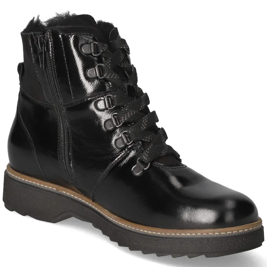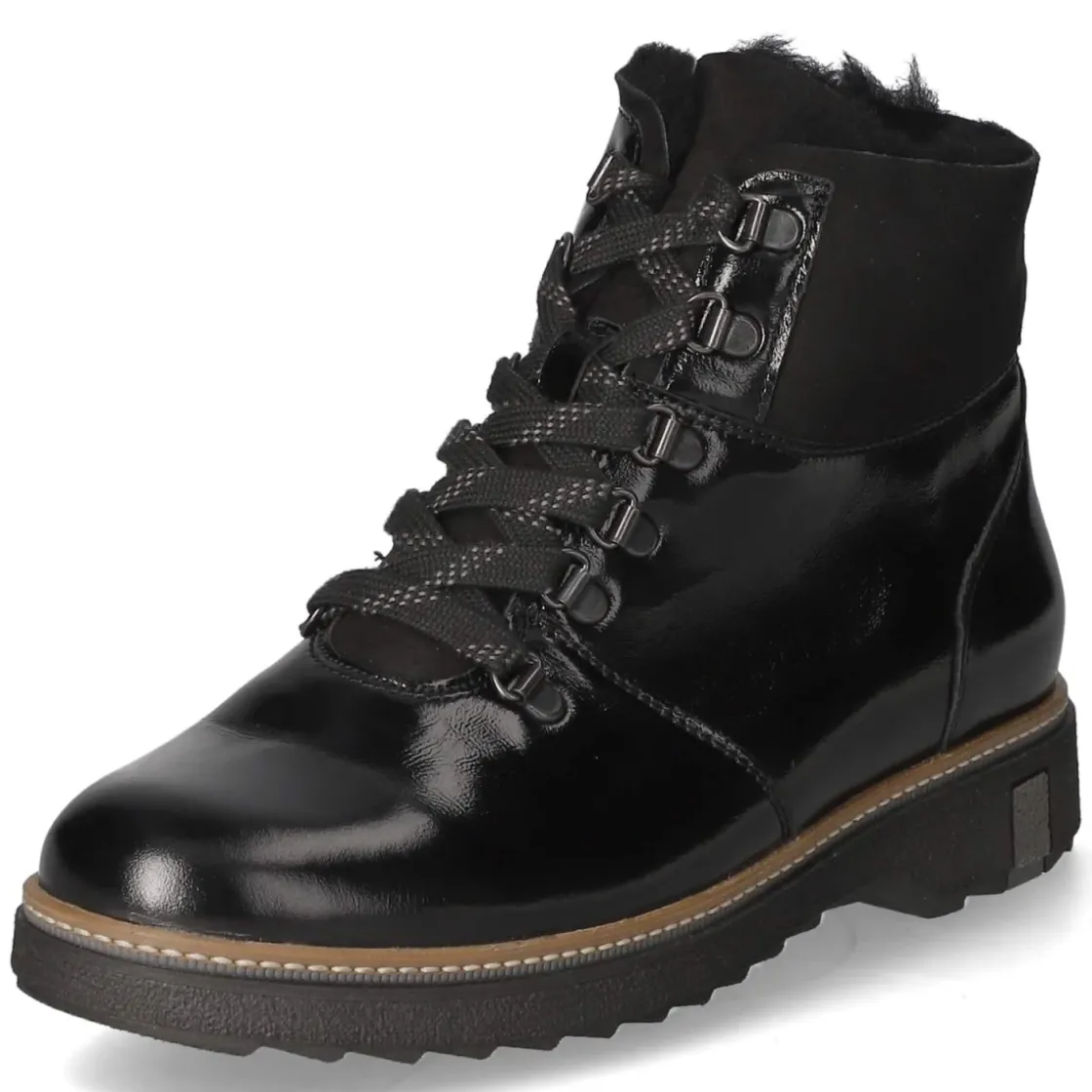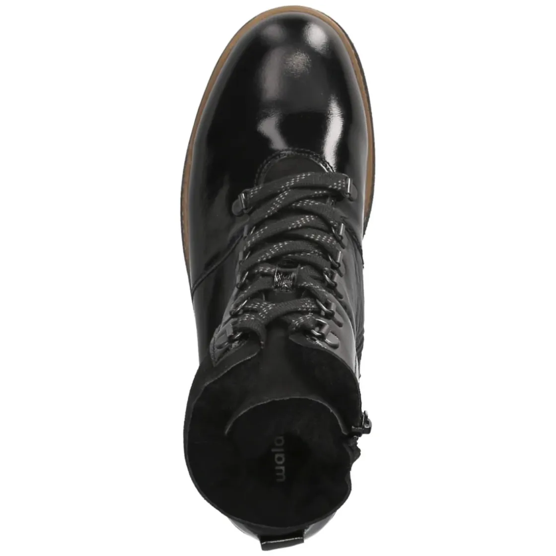 Die Schnürstiefeletten HITOMI von Waldläufer verbinden elegante Lackoptik mit wintertauglicher Wärme. Schwarzes Lackleder verleiht einen edlen Glanz, die runde Spitze und der 3 cm hohe Blockabsatz sorgen für ein entspanntes Gehgefühl. Warmfutter umschließt den Fuß verlässlich an kalten Tagen, während verstärkter Zehen- und Fersenbereich Stabilität bieten. Ein Mix aus Schnürsenkeln und Reißverschluss erleichtert das An- und Ausziehen, die Anziehlasche unterstützt zusätzlich. Die gepolsterte, herausnehmbare Decksohle schont die Füße und lässt Raum für eigene Einlagen; die flexible Laufsohle federt jeden Schritt. Die Passform fällt normal aus und rundet den sympathischen Look alltagstauglich ab. Modetipp: Besonders stimmig zu Wollmantel, Strickkleid und blickdichter Strumpfhose oder als glänzender Akzent zu Denim und Oversize-Blazer.