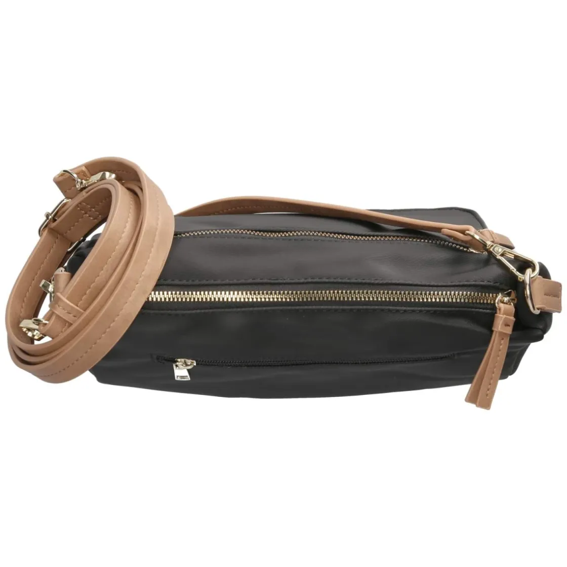 Eine schwarze Handtasche für Damen, die Eleganz und Funktion vereint: Das kompakte Format von ca. 15 x 26 x 8 cm bietet Platz für Essentials, während der sichere Reißverschluss diskret alles zusammenhält. Zwei Reißverschlussaußenfächer schaffen schnellen Zugriff, innen sorgen ein Steckfach und ein zusätzliches Reißverschlussfach für Ordnung. Goldene Label-Akzente und Details setzen edle Glanzpunkte, der verstärkte Boden bewahrt die Form und lässt die Tasche standfest wirken. Zwei abnehmbare Schulterriemen eröffnen Tragevarianten: ein kürzerer ca. 40 cm, dazu ein verstellbarer Riemen bis ca. 140 cm für lässiges Crossbody. So begleitet das Modell mühelos vom Büro bis zum Dinner. Modetipp: Schwarze Allover-Looks mit goldfarbenem Schmuck und spitzen Slingbacks lassen die Hardware strahlen und verlängern optisch die Silhouette.