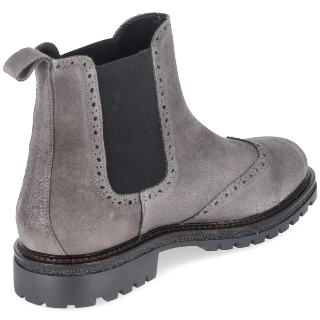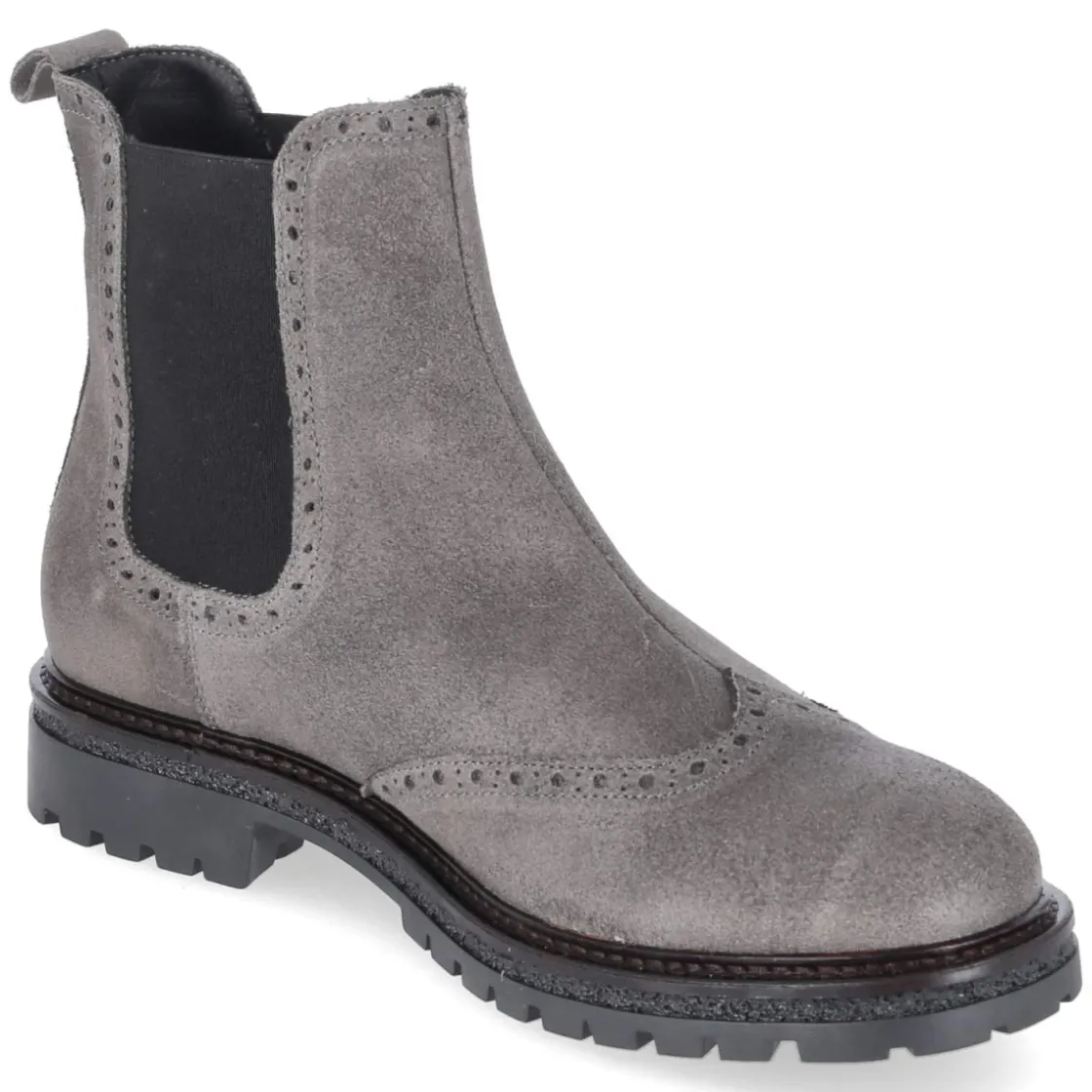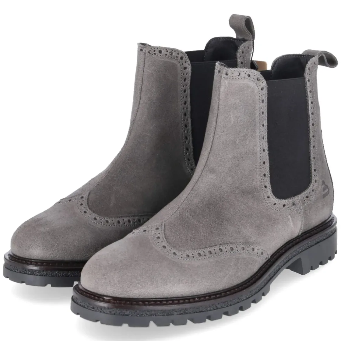 Der Chelsea Boot von Bullboxer präsentiert eine maskuline Silhouette mit rund zulaufender Spitze und feinem Budapester Lochmuster. Weiches Rauleder aus langlebigem Echtleder trifft auf eine verstärkte Ferse und zwei große, seitliche Elastikeinsätze, die zusammen mit Anziehlasche und verschlussloser Konstruktion einen unkomplizierten Einstieg ermöglichen. Ein stabiler Blockabsatz von 3 cm und die rutschhemmende Laufsohle sorgen für souveränen Halt im Alltag. Die textile Decksohle bietet angenehme Fußklimatisierung, das herausnehmbare Wechselfußbett ermöglicht individuelle Anpassung, auch für eigene Einlagen geeignet. Der Herren-Boot fällt größengetreu aus und überzeugt mit dezenter Graunuance, die Business wie Freizeit mühelos verbindet. Modetipp: Mit schmaler Wollhose in Anthrazit und geripptem Rollkragen entsteht ein cleaner Look, der durch einen grauen Mantel in knielanger Form perfekt abgerundet wird.