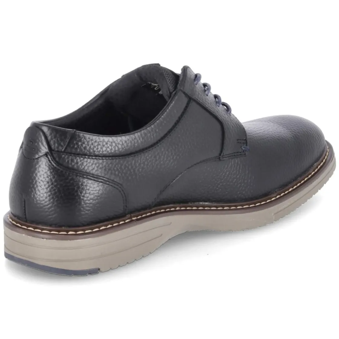 Der Halbschuh von Bullboxer vereint klassische Eleganz mit alltagstauglichem Komfort. Schwarzes Glattleder in langlebiger Echtleder-Qualität formt eine zeitlose, runde Silhouette, die durch die blaue Schnürung einen feinen modernen Akzent erhält. Das handgefertigte Finish, ein geringes Gewicht und der leicht gepolsterte Einstieg sorgen für ein angenehmes Tragegefühl vom ersten Schritt an. Die textile Decksohle und das gepolsterte, herausnehmbare Wechselfußbett bieten bequeme Unterstützung, während der verstärkte Fersenbereich Stabilität verleiht. Eine flexible Laufsohle mit leichtem Profil und rutschhemmendem Fersenelement erhöht die Trittsicherheit im urbanen Alltag. Fällt normal aus und ist dezent gelabelt – ideal für Büro und Freizeit. Modetipp: Mit schmaler Chino, dunklem Sakko und Ledergürtel entsteht ein smarter Look; dezente Stricksocken greifen den Blauton der Schnürung stilvoll auf.