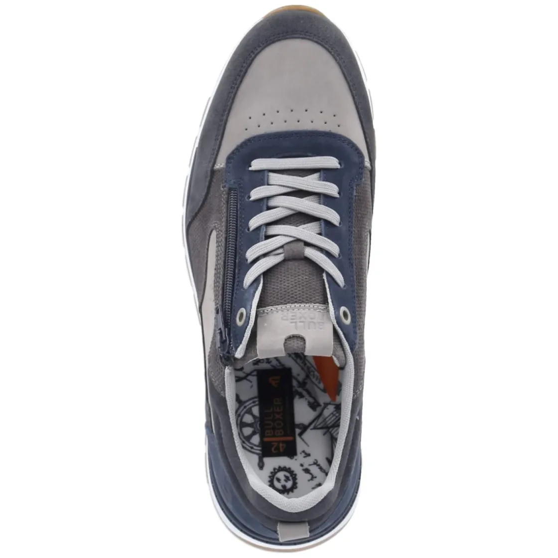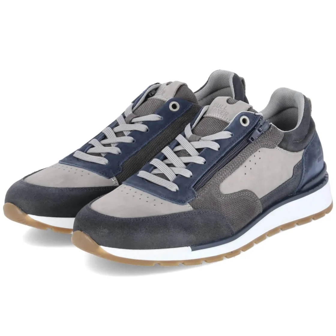 Der Bullboxer Low Sneaker überzeugt mit einer zeitlosen Silhouette und markantem Farbspiel aus Blau mit dezenten grauen Elementen. Langlebiges Echtleder prägt das Obermaterial, während der rund gearbeitete Leisten, ein gepolsterter Einstieg und die flexible, rutschhemmende Laufsohle für angenehmes Tragegefühl im Alltag sorgen. Dezente Lochungen setzen sportive Akzente und unterstützen die Luftzirkulation. Die Kombination aus Schnürsenkeln und seitlichem Reißverschluss erleichtert den Einstieg, das komfortable Wechselfußbett mit Decksohle aus Textil lässt sich bei Bedarf austauschen. Verstärkte Zehen- und Fersenbereiche erhöhen die Formstabilität. In Handarbeit gefertigt, passt das Modell normal in der Größe und bietet vielseitige Styling-Optionen. Modetipp: Zu Raw-Denim, hellgrauem Hoodie und Strukturmantel entsteht ein moderner City-Look.