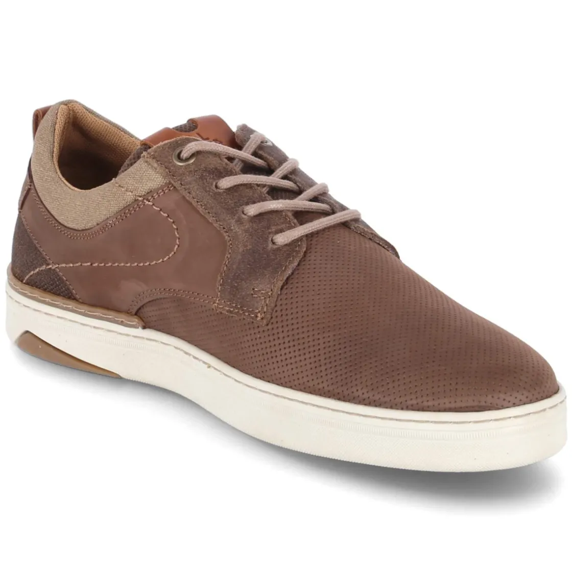 Der Low Sneaker von Bullboxer verbindet maskuline Lässigkeit mit urbaner Alltagstauglichkeit. Das Obermaterial aus Leder und Textil zeigt eine fein geprägte Oberfläche, akzentuiert durch eine seitlich geschwungene Ziernaht. Die runde Spitze und die klassische Schnürung unterstreichen den zeitlosen Look, gelabelte Details setzen dezente Markenakzente. Für Komfort sorgen gepolsterter Einstieg, verstärkter Fersenbereich sowie das weich gepolsterte, herausnehmbare Fußbett, das sich bei Bedarf gegen eigene Einlagen tauschen lässt. Die flexible, griffige Cupsohle bietet verlässlichen Halt auf verschiedenen Untergründen. In warmem Braun lässt sich das Modell vielseitig kombinieren und begleitet vom Büro bis in die Freizeit. Größenhinweis: fällt normal aus. Modetipp: Mit dunkler Denim, grauem Strickpullover und einem leichten Wollmantel entsteht eine cleane, moderne Silhouette mit smarter Note.
