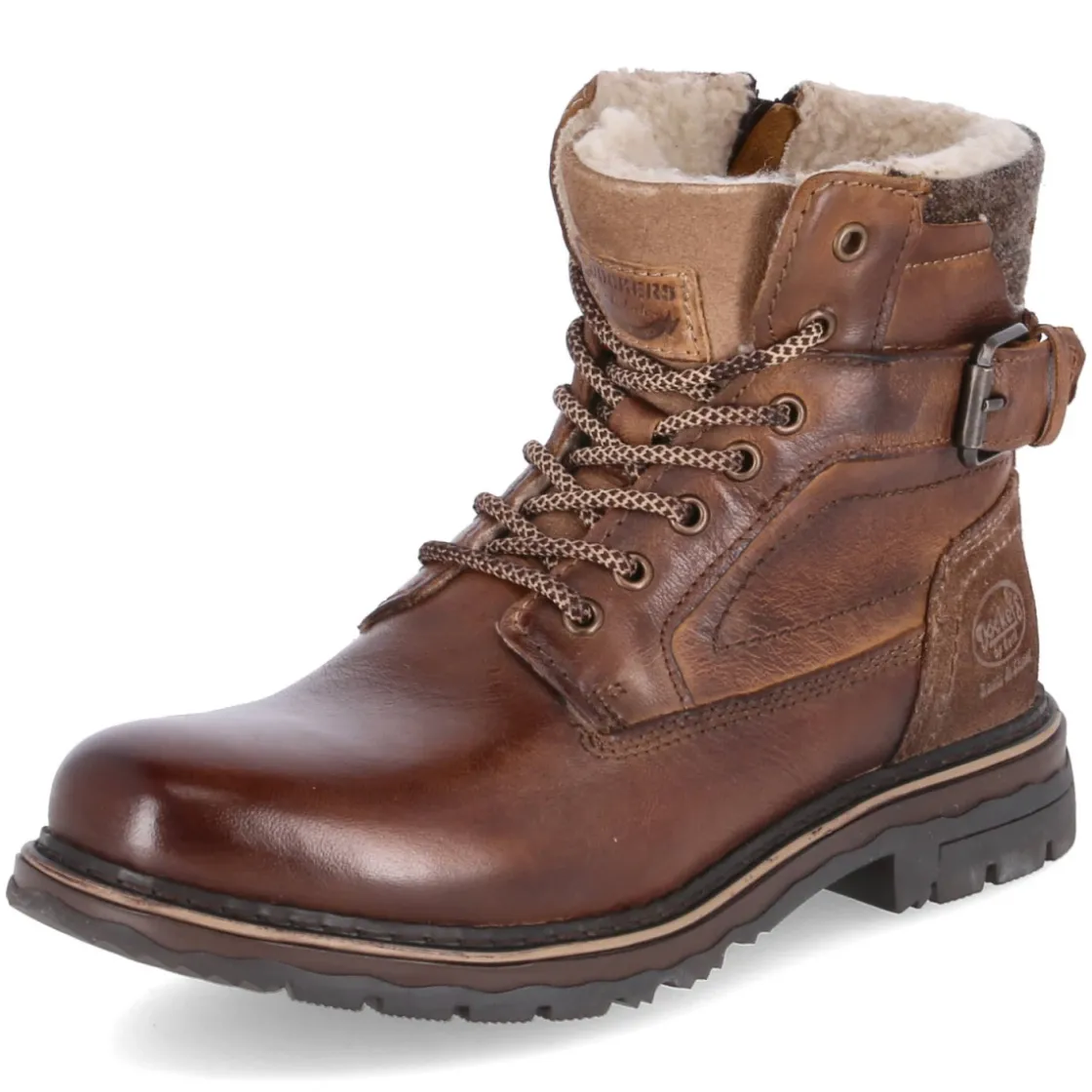 Der Herren-Winterboot von Dockers präsentiert sich in klassischem Braun und setzt auf langlebige Qualität. Das glatte Obermaterial aus robustem Echtleder trifft auf eine runde Schuhspitze und einen stabilen Blockabsatz von 3,5 cm, der sicheren Halt auf winterlichen Wegen bietet. Für behagliche Wärme sorgt das Warmfutter, während die textile Decksohle angenehmen Tragekomfort liefert. Praktisch: Die Kombination aus Schnürung und seitlichem Reißverschluss, ergänzt durch einen zusätzlichen Reißverschluss, macht den Einstieg unkompliziert und den Sitz verlässlich. Die Passform fällt normal aus und passt damit mühelos in die gewohnte Größe. Ein stimmiger Begleiter für kalte Tage mit markantem Auftritt. GÖTZ-Artikelnummer = 162300201762. Modetipp: Zu Raw-Denim, Wollsocken und einem dunkelgrünen Parka entsteht ein maskuliner Winterlook mit urbaner Note.