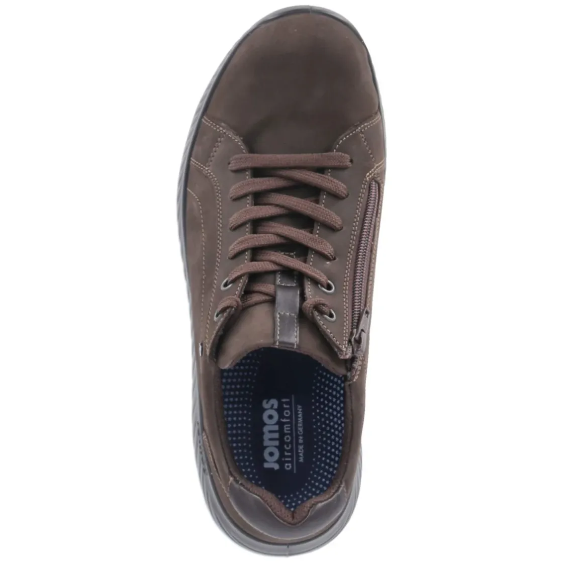 Der Herren-Halbschuh von Jomos in dunkelbraunem Rauleder vereint robuste Langlebigkeit mit dezenter Eleganz. Das hochwertige Echtleder zeigt eine fein strukturierte Oberfläche, die sich angenehm anschmiegt und den Fuß dank leicht gepolstertem Einstieg zuverlässig umschließt. Für praktischen Komfort sorgt die Kombination aus Schnürsenkeln und seitlichem Reißverschluss, die sicheren Halt und schnelles An- und Ausziehen ermöglicht. Die runde Schuhspitze gewährt Zehenfreiheit, während die textile Decksohle in Verbindung mit dem komfortablen Wechselfußbett für ein ausgeglichenes Fußklima steht. Eine flexible, rutschfeste Laufsohle und die verstärkte Ferse bieten Stabilität im Alltag. Fällt normal aus und passt mühelos zu zahlreichen Outfits. Modetipp: Zu einer sandfarbenen Chino und einem Strickpullover entsteht ein smarter Casual-Look mit ruhiger, wertiger Ausstrahlung.