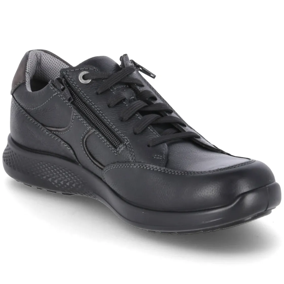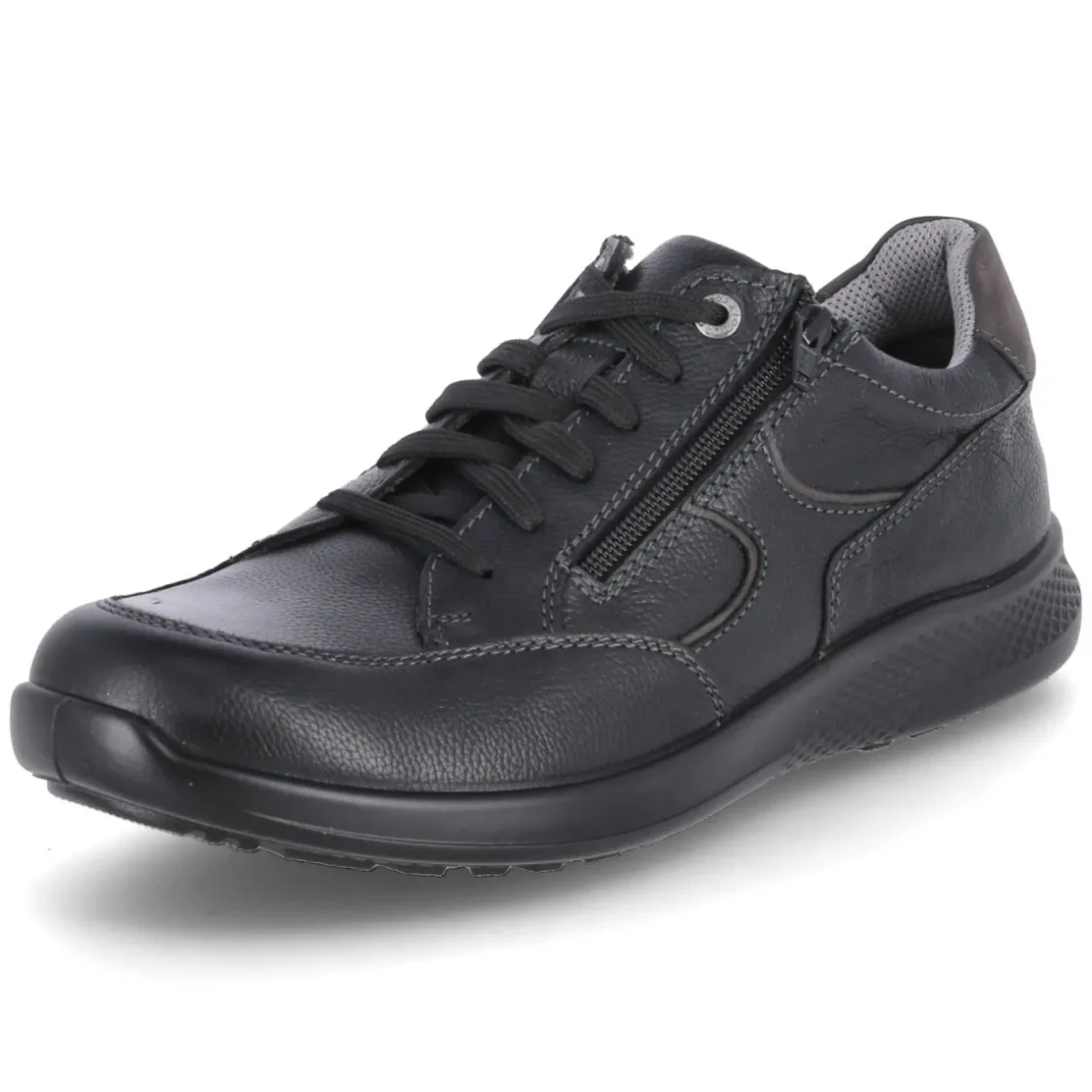Klassischer Auftritt und komfortabler Alltagspartner: Der schwarze Halbschuh von Jomos verbindet elegantes Glattleder mit durchdachten Details. Das langlebige Echtleder verleiht eine wertige Optik, die runde Schuhspitze sorgt für angenehme Zehenfreiheit. Schnürsenkel garantieren den passgenauen Sitz, der zusätzliche Reißverschluss ermöglicht ein schnelles An- und Ausziehen. Innen überzeugt eine Decksohle aus Leder, die ein angenehmes Tragegefühl unterstützt. Das komfortable Wechselfußbett bietet Flexibilität, etwa beim Einsatz eigener Einlagen. Die Passform fällt normal aus und macht den Schuh zum unkomplizierten Begleiter für Büro und Freizeit. Modetipp: Zu schmalen Chinos und einem feinen Strickpullover entsteht ein zeitloser Look, der mit einem schwarzen Ledergürtel perfekt abgerundet wird.