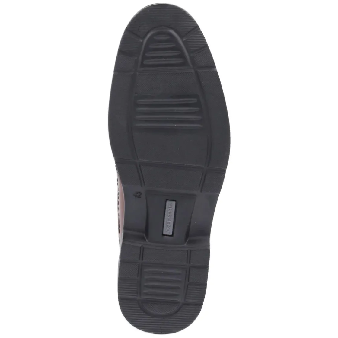 Der Herren-Slipper ALASTAIR 03 von Josef Seibel verbindet zeitlose Linie mit hohem Tragekomfort. Glattes, langlebiges Echtleder in warmem Braun unterstreicht die wertige Optik, Ziernähte und ein dezentes Labelpatch setzen Akzente. Die runde Schuhspitze bietet angenehm Platz, während der 3 cm hohe Blockabsatz sicheren Stand gewährleistet. Dank Elastikeinsätzen lässt sich das Modell ohne Verschluss bequem an- und ausziehen, der gepolsterte Einstieg schmiegt sich weich an. Die Decksohle aus Leder sorgt für ein angenehmes Fußklima, das komfortable Wechselfußbett kann bei Bedarf gegen eigene Einlagen getauscht werden. Der Schuh fällt normal aus und eignet sich für vielfältige Anlässe zwischen Büro und Freizeit. Modetipp: Mit Chino in Sand und feinem Merino-Cardigan entsteht ein smarter Look, der das braune Glattleder edel zur Geltung bringt.