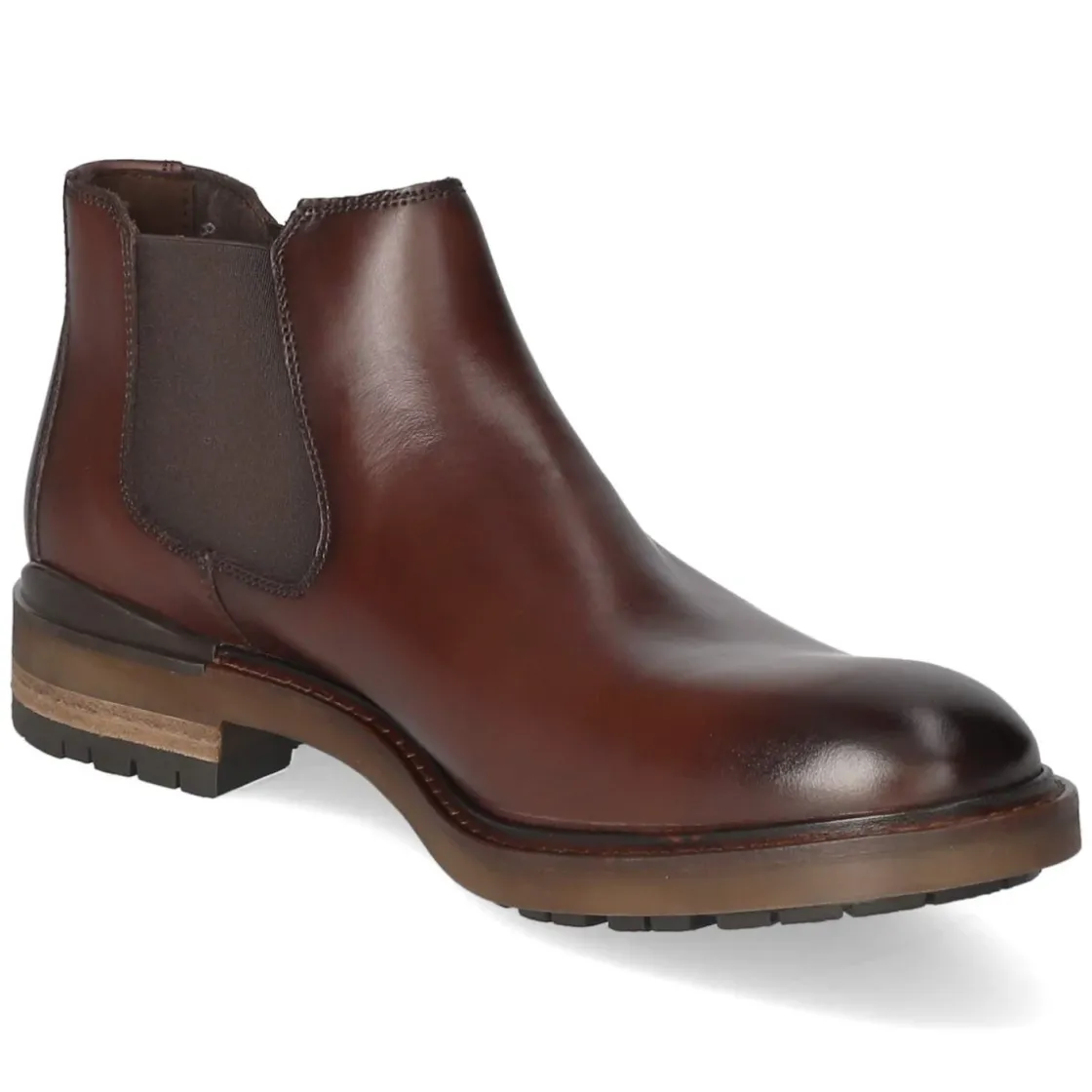 Die Chelsea Boots VIBE 315 von LLoyd vereinen zeitlose Silhouette und komfortable Ausstattung. Das braune Glattleder aus atmungsaktivem Echtleder sorgt für ein angenehmes Fußklima, während die rund zulaufende Kappe und der 2 cm hohe Blockabsatz den klassischen Ausdruck betonen. Dank Schlupfdesign mit elastischen Einsätzen sitzt der Schuh sicher am Fuß und lässt sich mühelos an- und ausziehen. Die flexible, griffige Laufsohle bietet Halt im Alltag, die verstärkte Ferse stabilisiert zusätzlich. Eine synthetische Decksohle zeigt sich pflegeleicht und strapazierfähig, der Fit fällt normal aus. Seitliche Prägung und fein gesetzte Nähte runden den Look ab. Modetipp: Zu dunkler Raw Denim, Rollkragen und Wollmantel entsteht ein souveränes Ensemble zwischen Business Casual und Weekend-Style.