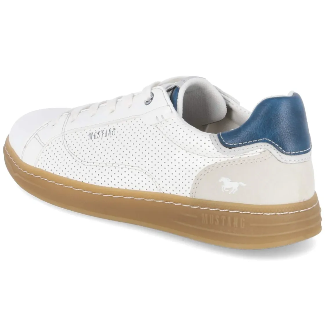 Der weiße Halbschuh von Mustang übersetzt cleanes Design in alltagstauglichen Komfort. Das robuste Obermaterial aus Synthetik präsentiert sich mit fein gelochten Seiten, die für dezente Luftzirkulation sorgen, während blaue und graue Details sportliche Akzente setzen. Eine runde Schuhspitze, die flexible, rutschhemmende Cupsohle und der gepolsterte Einstieg schaffen angenehme Bewegungsfreiheit. Das gepolsterte Fußbett und die textile Decksohle unterstützen ein bequemes Tragegefühl, der verstärkte Fersenbereich erhöht die Stabilität. Dank Schnürsenkeln lässt sich der Sitz präzise justieren, typische Markendetails runden den Look ab. Der Herren-Schuh fällt normal aus und erweist sich mit seiner pflegeleichten Oberfläche als unkomplizierter Begleiter mit vielseitigen Kombinationsmöglichkeiten. Modetipp: Mit heller Chino und einem melierten Strickpullover entsteht ein smarter Casual-Look, der die weißen Nuancen und die farbigen Details harmonisch hervorhebt.