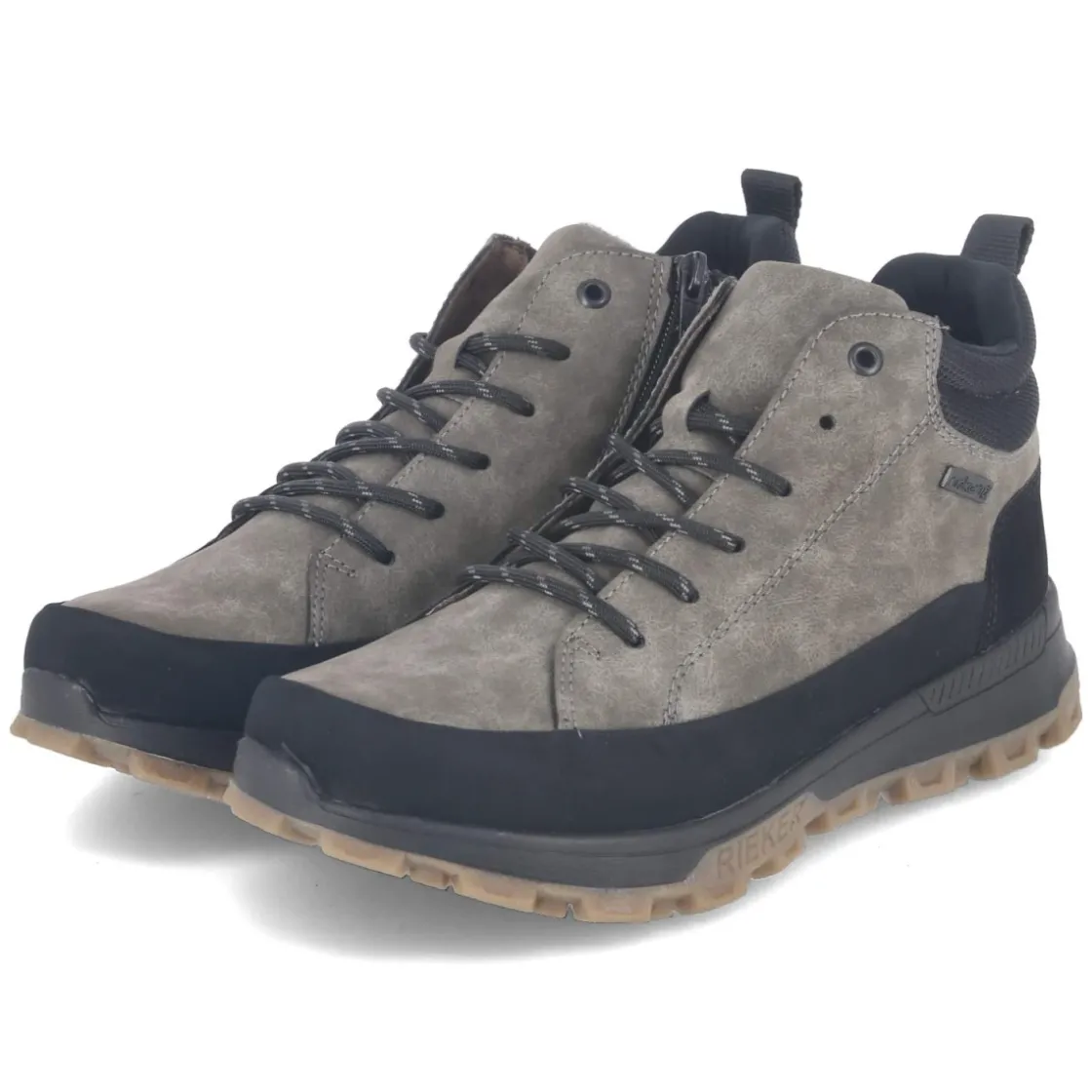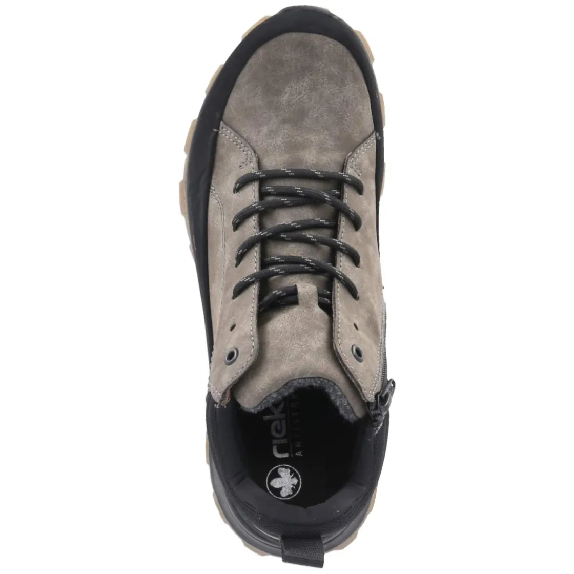 Der Herren-Boot von Rieker setzt auf zuverlässige Performance bei wechselhaftem Wetter. Das synthetische Obermaterial präsentiert einen natürlichen Look in Braun, der je nach Licht von Grau bis leicht Grün schimmert, während schwarze Elemente einen markanten Kontrast bilden. Schnürsenkel und seitlicher Reißverschluss erleichtern den Einstieg, unterstützt von Anziehlasche und gepolstertem Schaft. Die runde Schuhspitze sowie der verstärkte Fersen- und Zehenbereich sorgen für Schutz und Langlebigkeit. Wasserfest und zugleich atmungsaktiv begleitet der Schuh durch kühle Tage, das leichte Futter hält angenehm warm. Die textile Decksohle mit Wechselfußbett bietet individuellen Komfort, die rutschfeste Profilsohle sicheren Halt auf nassem Untergrund. Fällt normal aus und passt damit unkompliziert in den Alltag. Modetipp: Perfekt zu Cargohose, grobem Strick und einem Parka in Khaki für einen stimmigen Outdoor-Look.