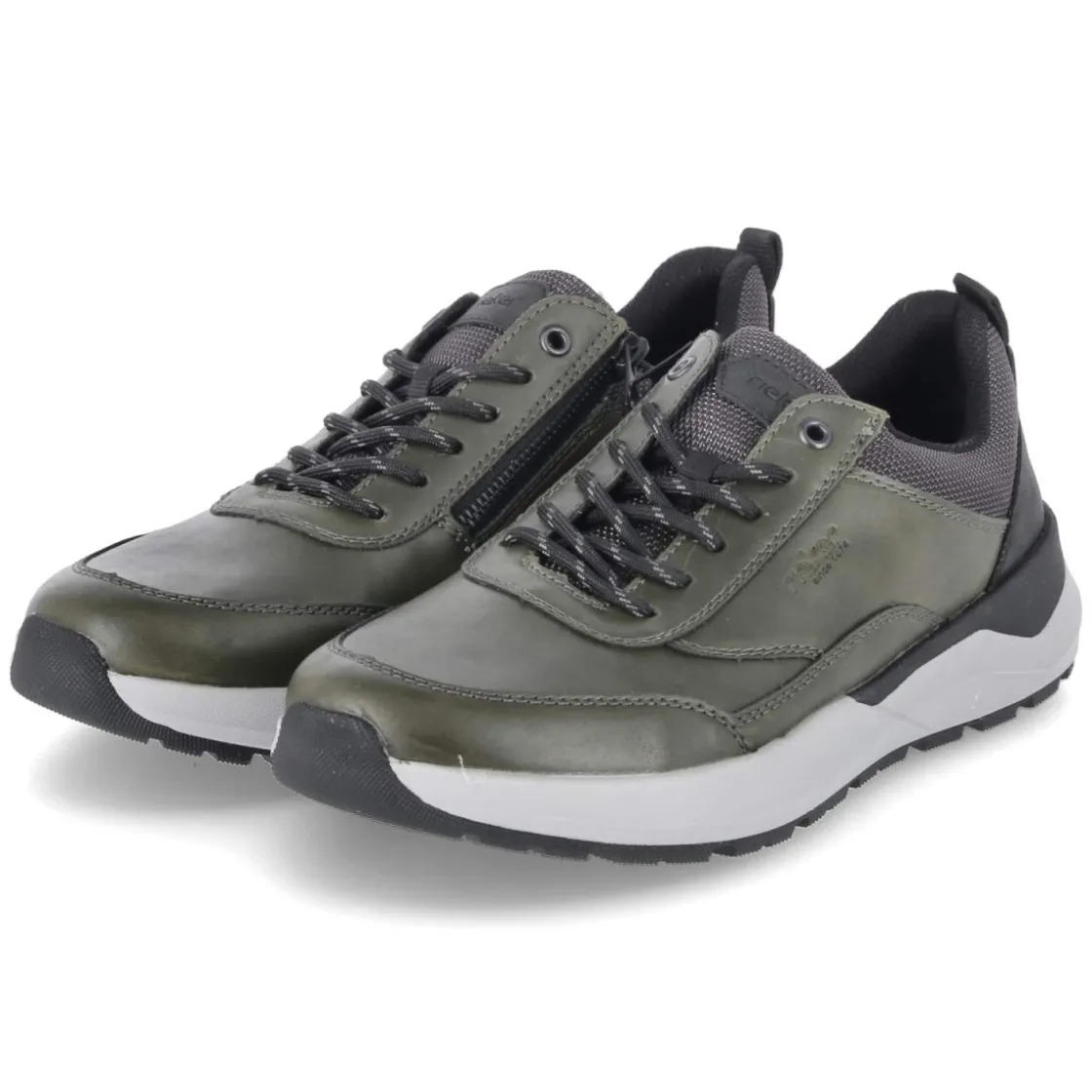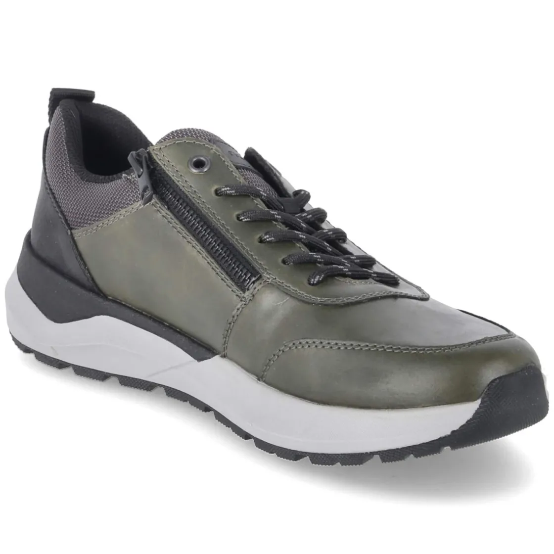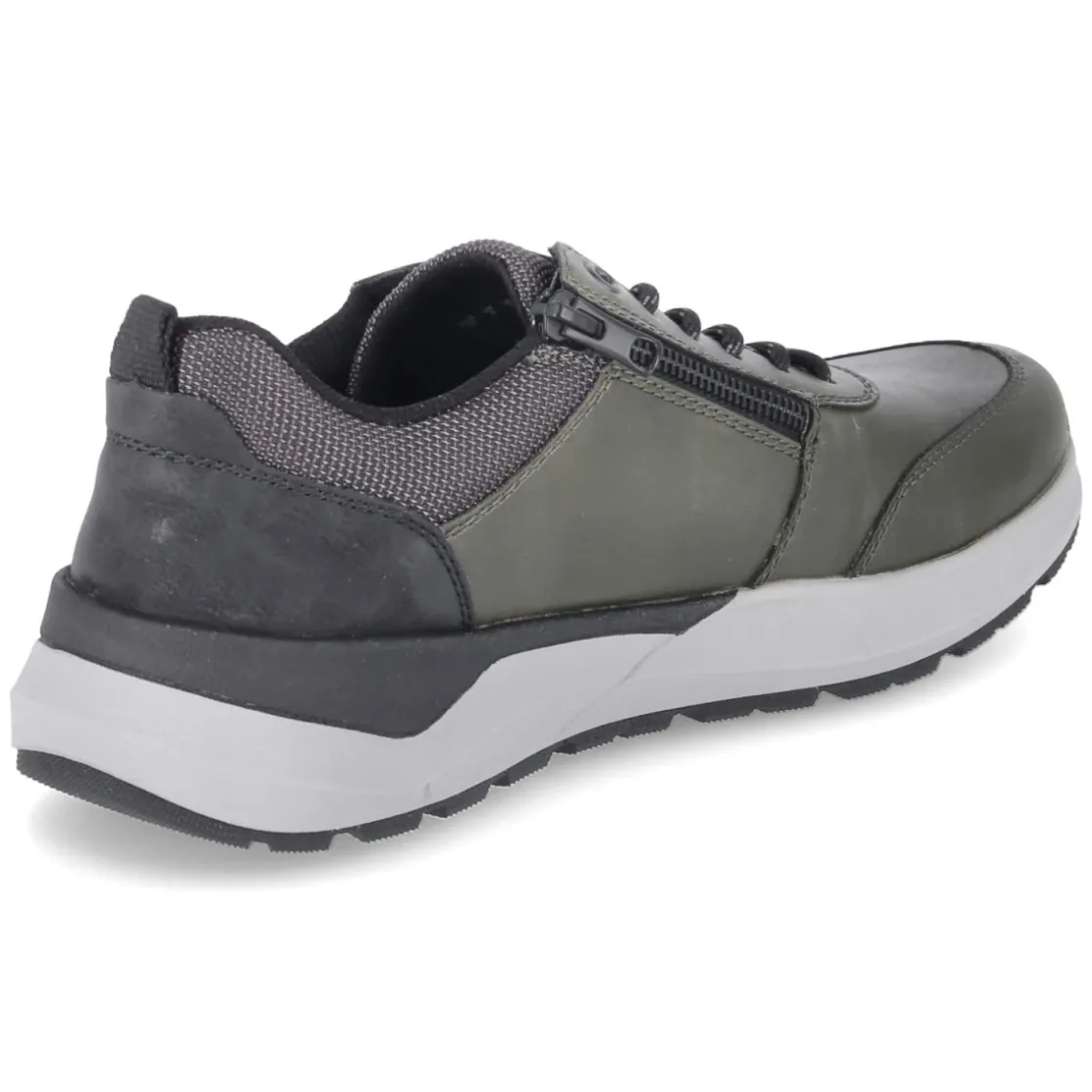 Der Herren-Halbschuh von Rieker in frischem Grün verbindet sportliche Optik mit praxisnahen Details für den Alltag. Das pflegeleichte Synthetik-Obermaterial lässt sich unkompliziert säubern und behält lange seine Form. Schnürsenkel und seitlicher Reißverschluss bieten eine Kombination aus passgenauer Fixierung und schnellem Einstieg, unterstützt von Anziehlasche und gepolstertem Schaftrand. Der runde Leisten schafft Zehenfreiheit, während der verstärkte Fersen- und Zehenbereich Stabilität gibt. Die flexible, griffige Laufsohle sorgt für zuverlässigen Halt auf unterschiedlichen Untergründen und ein dynamisches Abrollen. Innen liegt eine textile Decksohle auf einem gepolsterten, herausnehmbaren Fußbett, das sich bei Bedarf gegen eigene Einlagen tauschen lässt. Passformhinweis: fällt normal aus. Modetipp: mit dunkelgrauer Chino, leichtem Hoodie und Utility-Jacket einen smart-sportiven City-Look setzen.