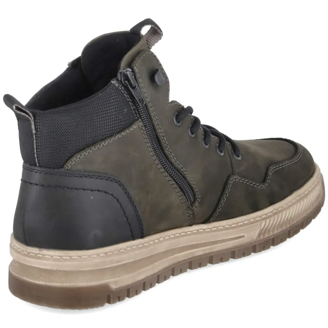 Urbaner Look trifft wetterfeste Funktion: Der grüne High Sneaker von Rieker setzt mit seinem dezenten Used-Look ein lässiges Statement und überzeugt mit einem wasserabweisenden, wasserfest verarbeiteten Obermaterial aus Leder und Synthetik. Schnürung und seitlicher Reißverschluss erleichtern den Einstieg, unterstützt von Anziehlasche und gepolstertem Schaftrand. Die runde Spitze, der verstärkte Fersen- und Zehenbereich sowie die rutschfeste Profilsohle sorgen für Halt und Stabilität im Alltag. Innen bietet eine weiche, textile Decksohle angenehmes Fußklima, während der Schnitt bewusst etwas schmaler ausfällt. Ein vielseitiger Begleiter für Herren, die bei wechselhaftem Wetter nicht auf Stil verzichten möchten. Modetipp: Besonders stimmig zu dunklen Slim-Jeans, olivfarbenen Chinos und einer leichten Bomberjacke; das Grün setzt dabei einen markanten Akzent.