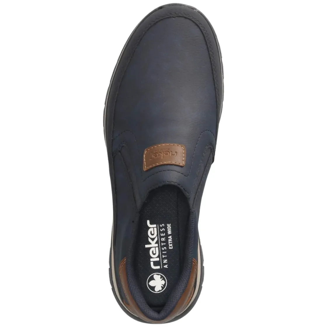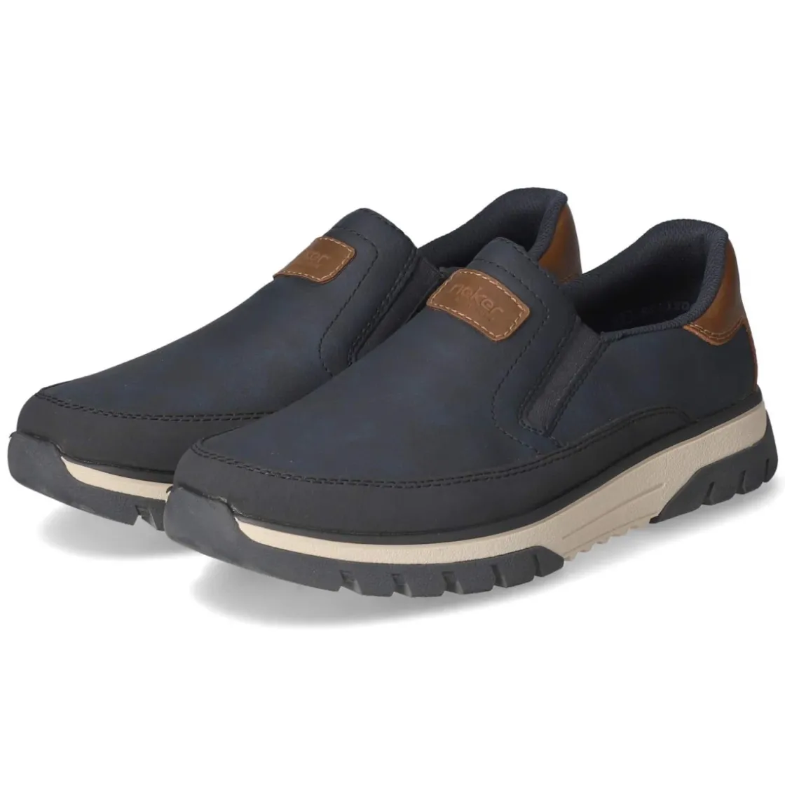 Dieser Herren-Slipper von Rieker verbindet lässige Optik mit hohem Tragekomfort. Das pflegeleichte Kunstleder in Blau wird durch dunkelblaue Partien und eine verstärkte Ferse in Braun akzentuiert und erhält durch feine Markendetails eine wertige Note. Der rund gearbeitete Leisten und der bequem gepolsterte Einstieg sorgen für ein angenehmes Gefühl im Alltag, während ein Elastikeinsatz am Spann den schlupffreien Sitz unterstützt. Ohne Verschluss lässt sich das Modell schnell an- und ausziehen. Die textile Decksohle und eine flexible, rutschfeste Laufsohle begleiten zuverlässig durch den Tag. Fällt größengetreu aus und eignet sich ideal für Erwachsene, die einen unkomplizierten Begleiter suchen. Modetipp: mit hellen Chinos und einem leichten Strickpullover kombinieren, dazu ein Gürtel in cognacfarbener Tonalität.